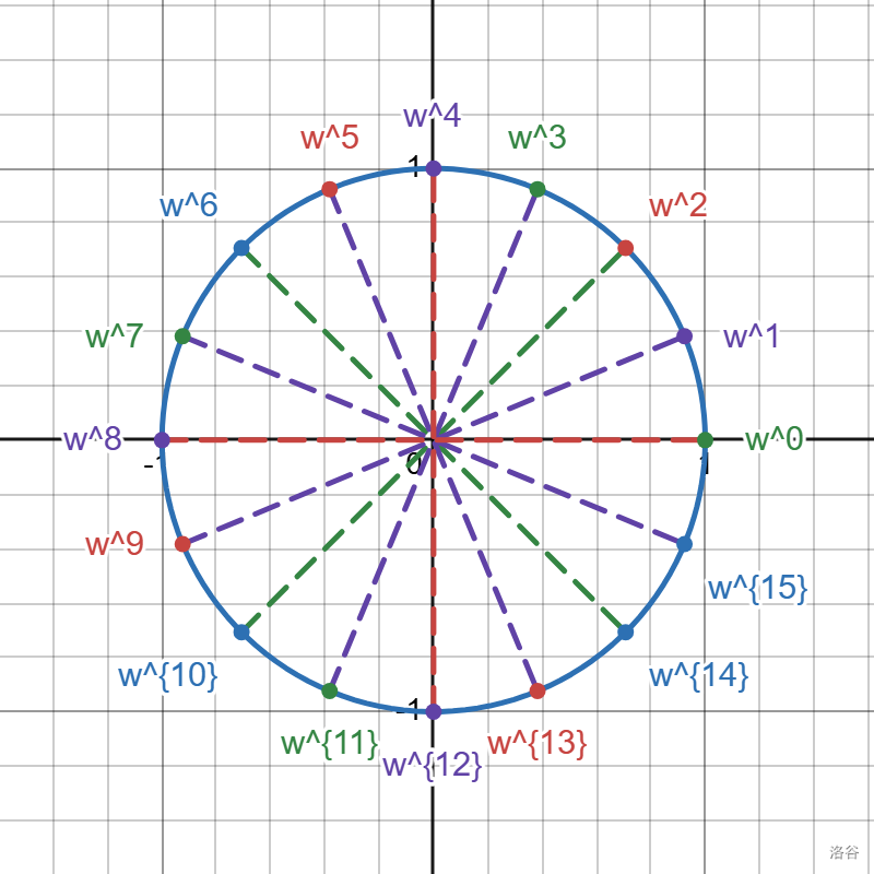 - 我们使用 $1$ 的 $n$ 个 $n$ 次方根,这样平方完,依然是正负成对出现的。