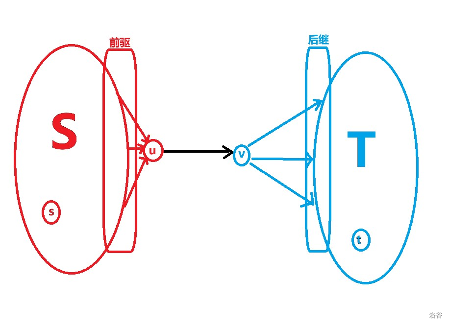 于是考虑按编号从小到大枚举每条边 来贪心构造 ,具体的,查看这条边是不是确定了 或 ,如果是,那么它肯定不能存在于最小割中;否则就将其加入最小割,并把 的前驱标记为属于 , 的后继标记为属于 。