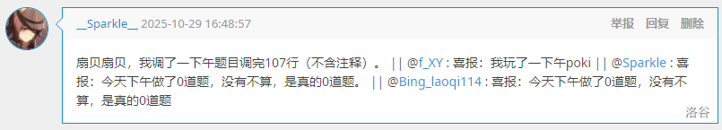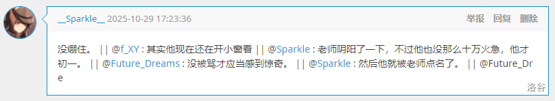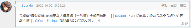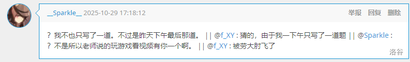 J 组 GESP 八级,暂且置之。昔居红岭之侧,地形熟矣,胜!试前忽发高热,败!见“you have no egg”,愕然一笑。试至末,头昏如醉,竟至睡去,大败特败!试毕,嗓痛难忍,歌《使一颗心免于哀伤》,胜!归家一测,乃甲流,遂卧床。(悲)及成绩出,竟亦过关,大胜特胜!