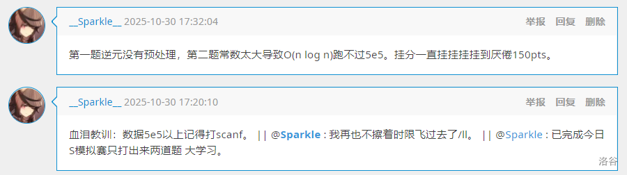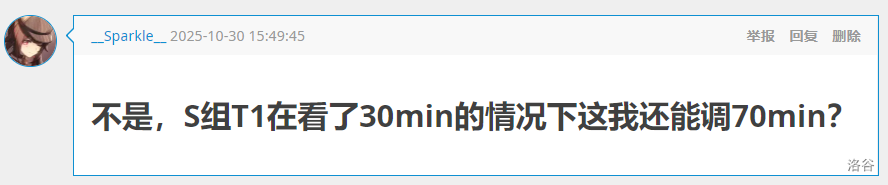 善哉,今将题解言之。(?)T1:览题之际,思若电光,察得唯有一社得众,遂速为之。然实悔贪心,赛终方知此法即反贪……前未闻反悔贪心之谓,然无师自通矣 。T2:睹题即思最小生成树,然码成而时超甚多。易 cin 为 scanf,犹不速,忽悟可仅存原图 MST,试之,大样例慢一秒余,证其复杂度可过。察机配置甚劣,遂罢不优(伏笔既埋)。T3:思可缩同,乃至拟用字典树,然不谙其术,憾失 10 分。T4:莫解,仅得[0,24]分。