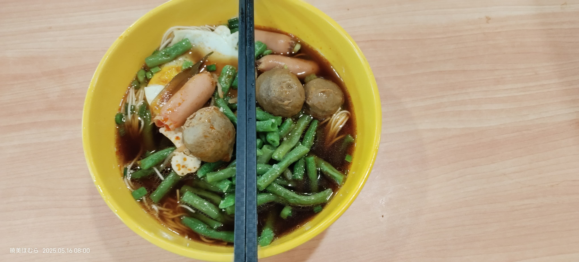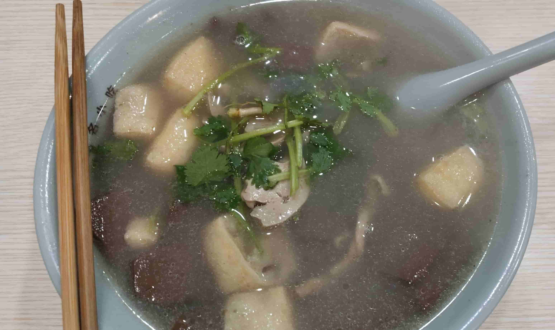 (鸭血粉丝汤。加一点点辣油真的很美味!)(在南宁,我们把图中的豆制品称为「油果」,似乎这个东西各地的叫法都不太一样?)