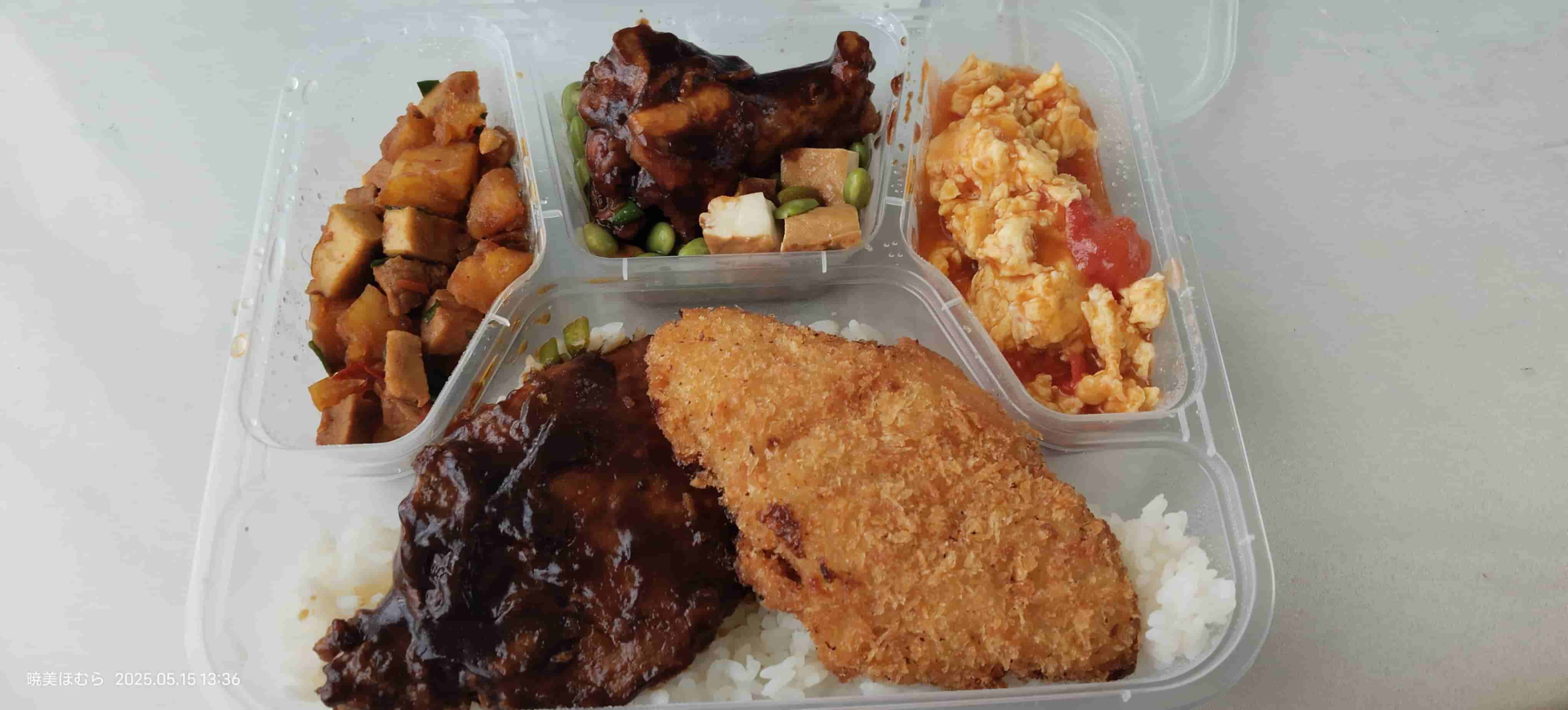 可以看到,左上的是土豆焖猪肉;土豆比较软烂,也很入味。上面中间的是青豆炒豆腐,上面还放了一个小鸡翅根,鸡翅根都被酱汁裹满了。青豆和豆腐相对要清新一些,没有那么重口。右上角的是经典的 ,酸甜可口。米饭的分量比较足,上面放了一块同样裹满酱汁的牛(猪?)排和炸鸡排。牛排和鸡腿的风味差不多,但是这个炸鸡排就炸得很面了,吃起来有点像在吃面包,我个人不太喜欢。