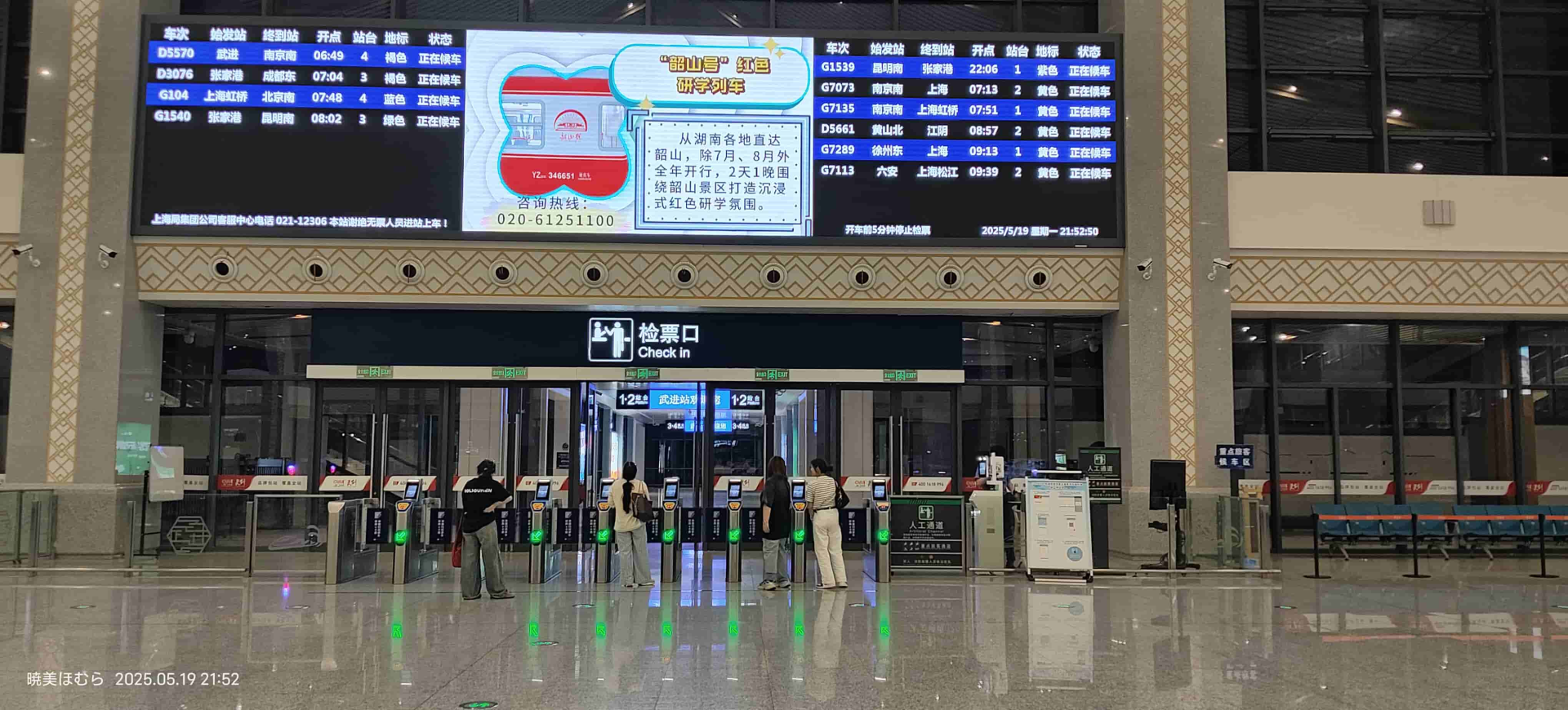 注意 在 时从苏州站发出,苏州站提前 停止检票,这意味着只有 时间可以换乘。好巧不巧这趟车晚点了 ,这下余量又少了。提前走到离便捷换乘处最近的车厢,第一个下车冲上去,跑到检票口的时候 已经停检了。多亏了好心的站务把我放了进去(按规定是不能放的),下到站台的时候刚好碰到 进站,我如愿以偿坐上了 。
