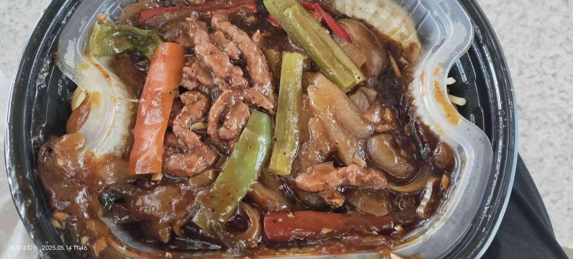在车上获取了今天的午餐。黑椒牛肉意面,听起来还不错。