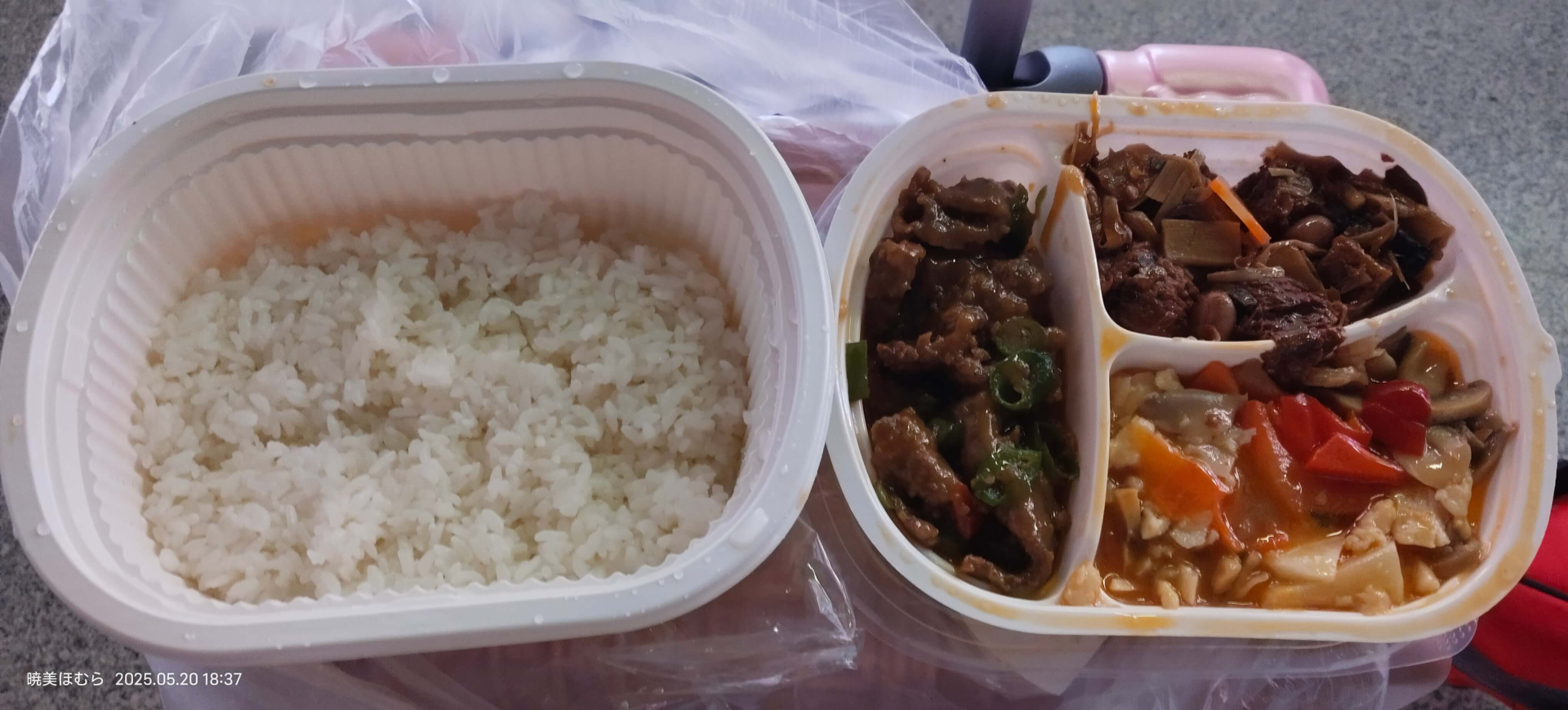 由于一直没吃东西,肚子很饿了,于是去餐车吃东西。盒饭还没卖完,于是吃上了 一份的盒饭。本来以为会很差劲,结果打开盖子出乎我的意料: