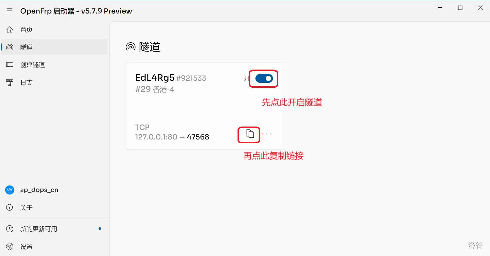 接着,会自动来到“隧道”页,可以按下述方式开启隧道并获取访问链接。