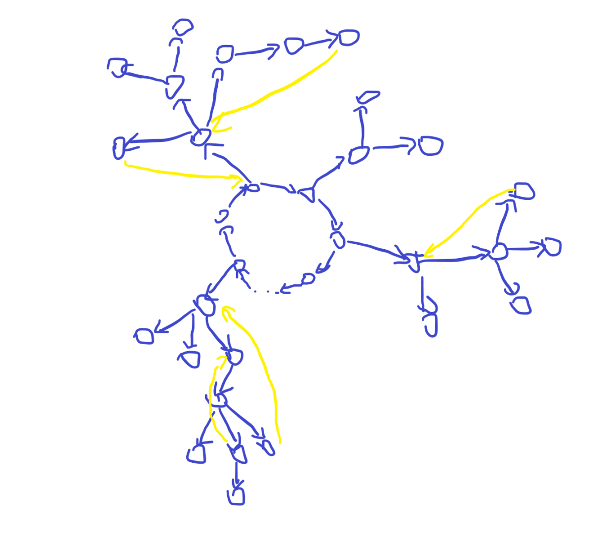 我们的条件只是不能存在两条以上简单路径,而存在多条只能经过重复结点的路径是可以被允许的。直接考虑有向图根本想象不出来怎么做,我们不妨考虑“根”出发的 DFS 树,想象在它上面从根开始找到 简单路径的过程。