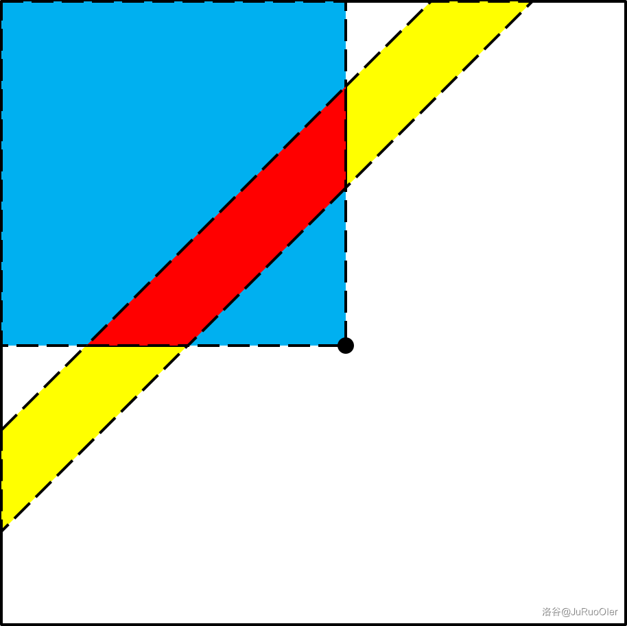 考虑在二维平面上刻画问题,用点的横纵坐标表示区间的左右端点。则点 的答案就是同时满足 和 的点集,即图中黄色区域和蓝色区域的交叠部分(红色区域)。