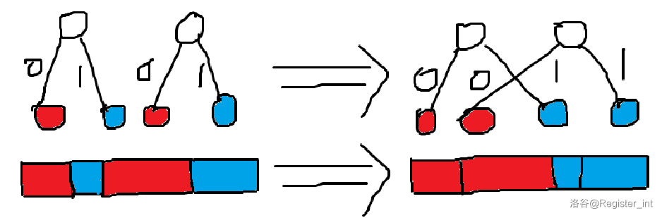 这个大概叫“蝴蝶变换”。方便起见把左子树方向称为红色,右子树方向称为蓝色。