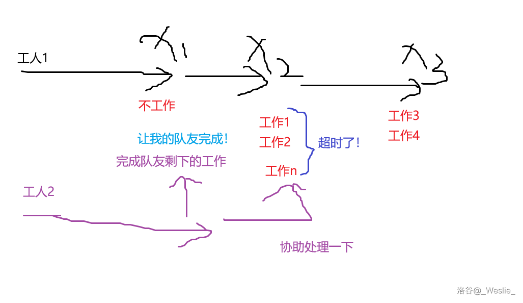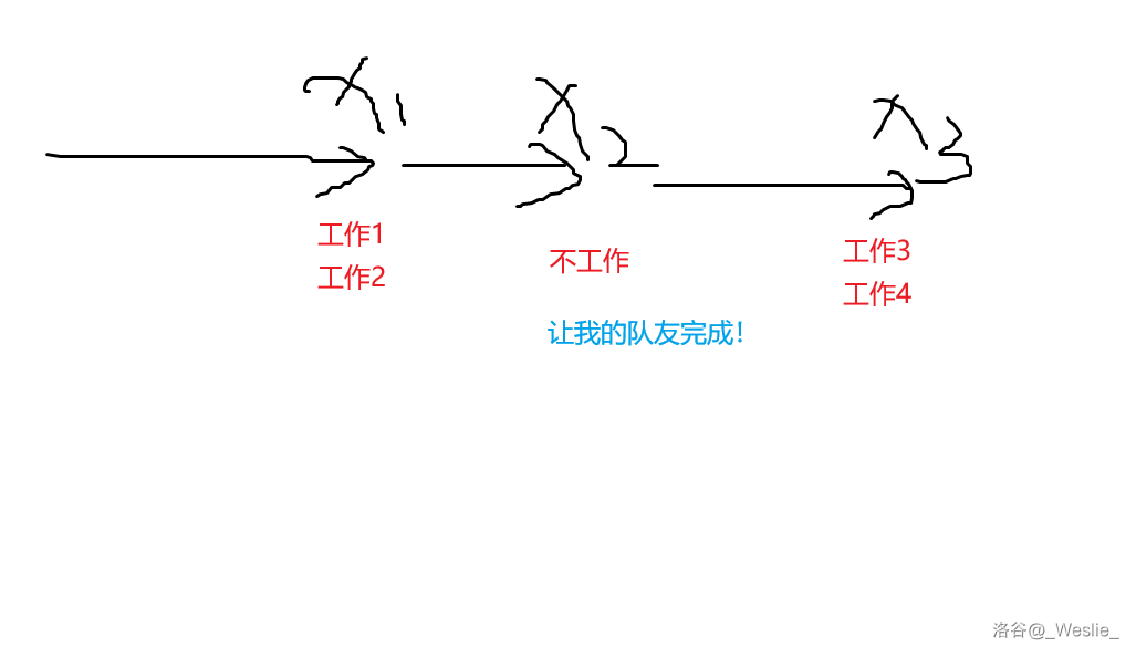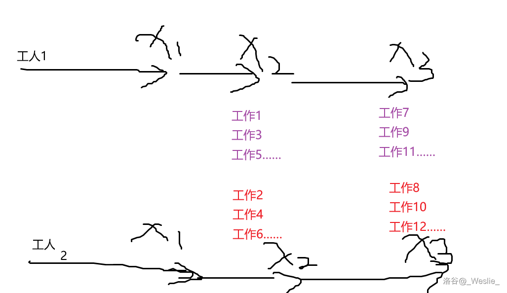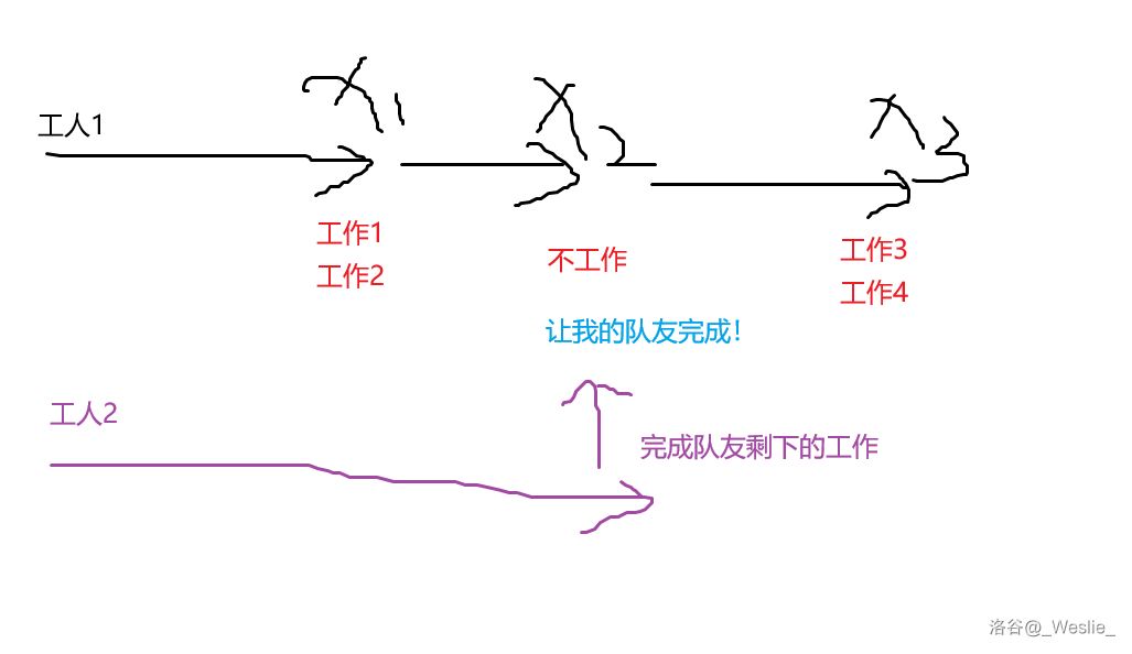 (两个人同时开始工作,同时在一个点工作,同时完成工作)