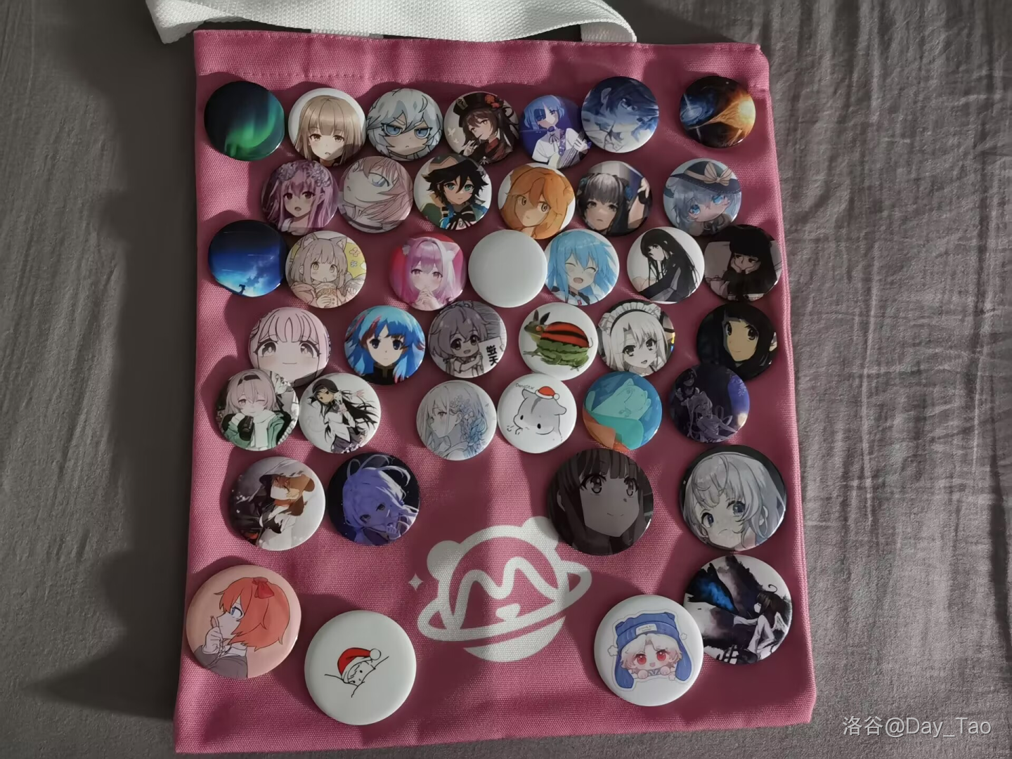 然后就回家了。回家先把徽章理了一下,因为 NOI 书包太硬了所以就扎在粉兔帆布袋上。徽章没还完还剩 5 个左右,但是竟然刚刚好。