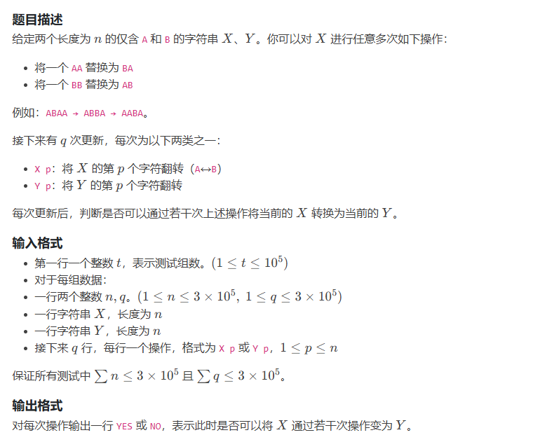 首先,我们要将这个变化方式转变为BA-->AA,AB--->BB,即现将每一个奇数位翻转,之后变化就成了减少连续段数,这样的话,我们就可以用线段树了,因为我们发现输出YES的情况只有任意一个前缀的连续段数量是上面的大于下面的,且最后一位字母相同,这样才能合理变化成下面的形式。