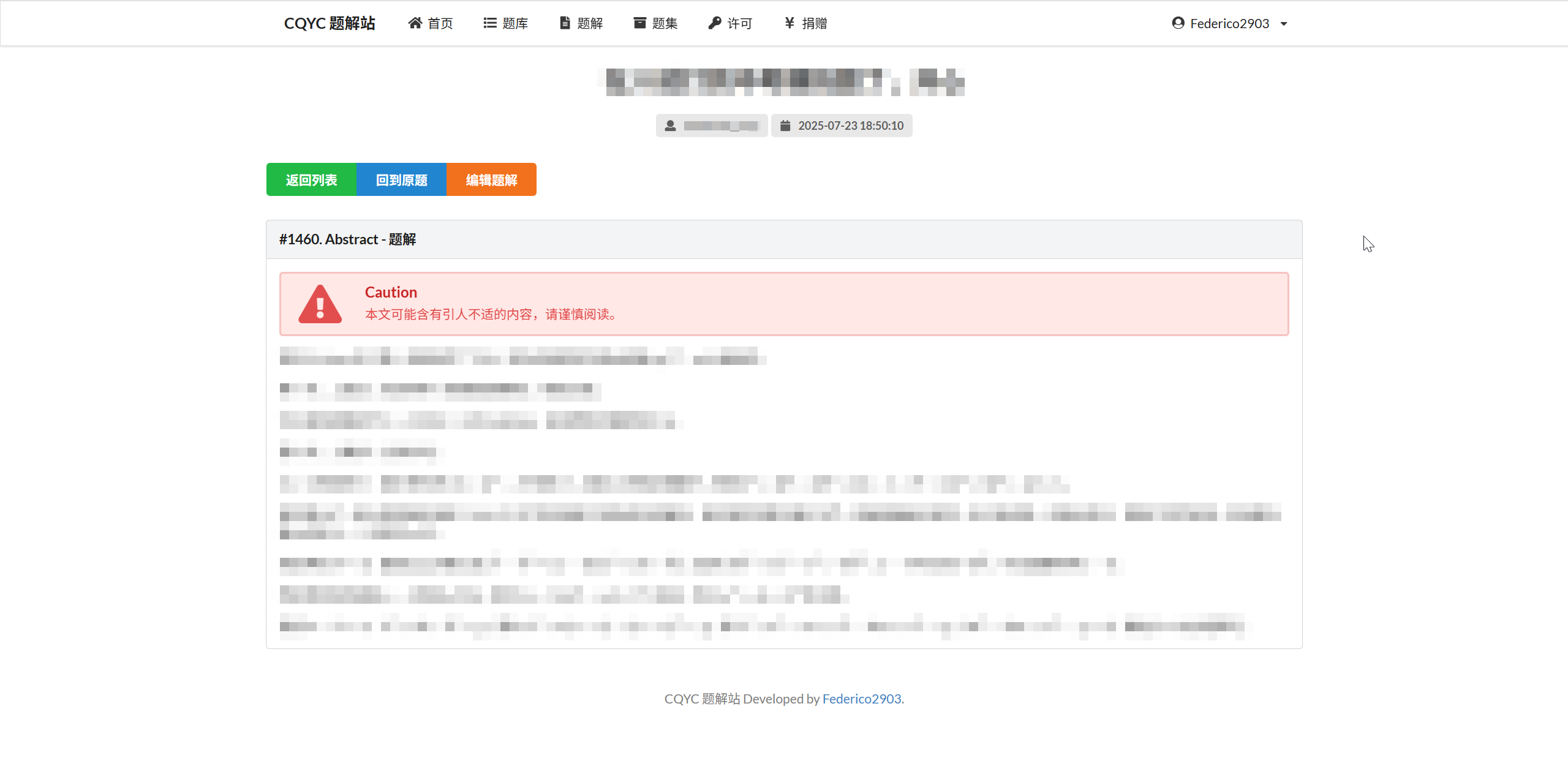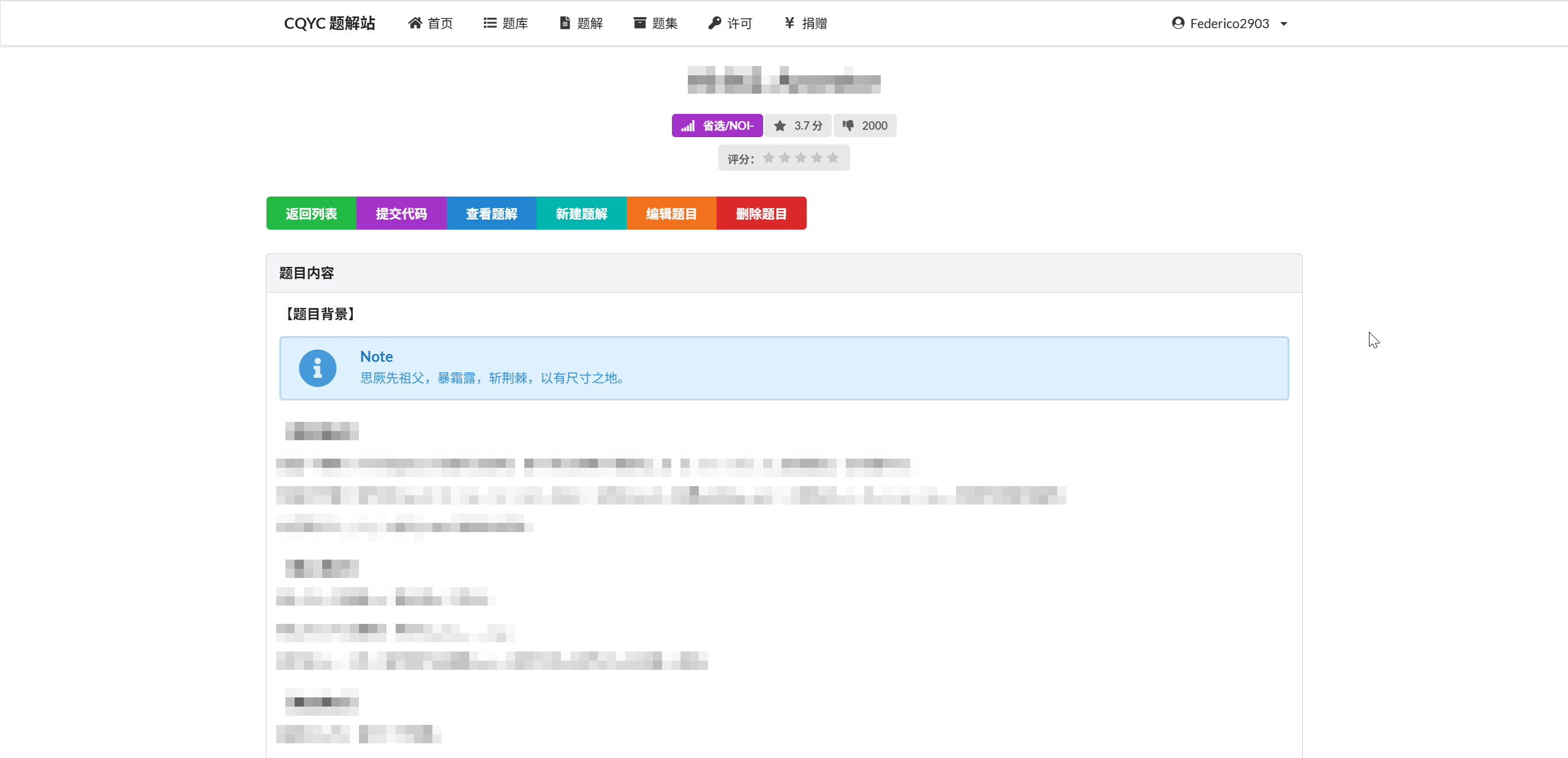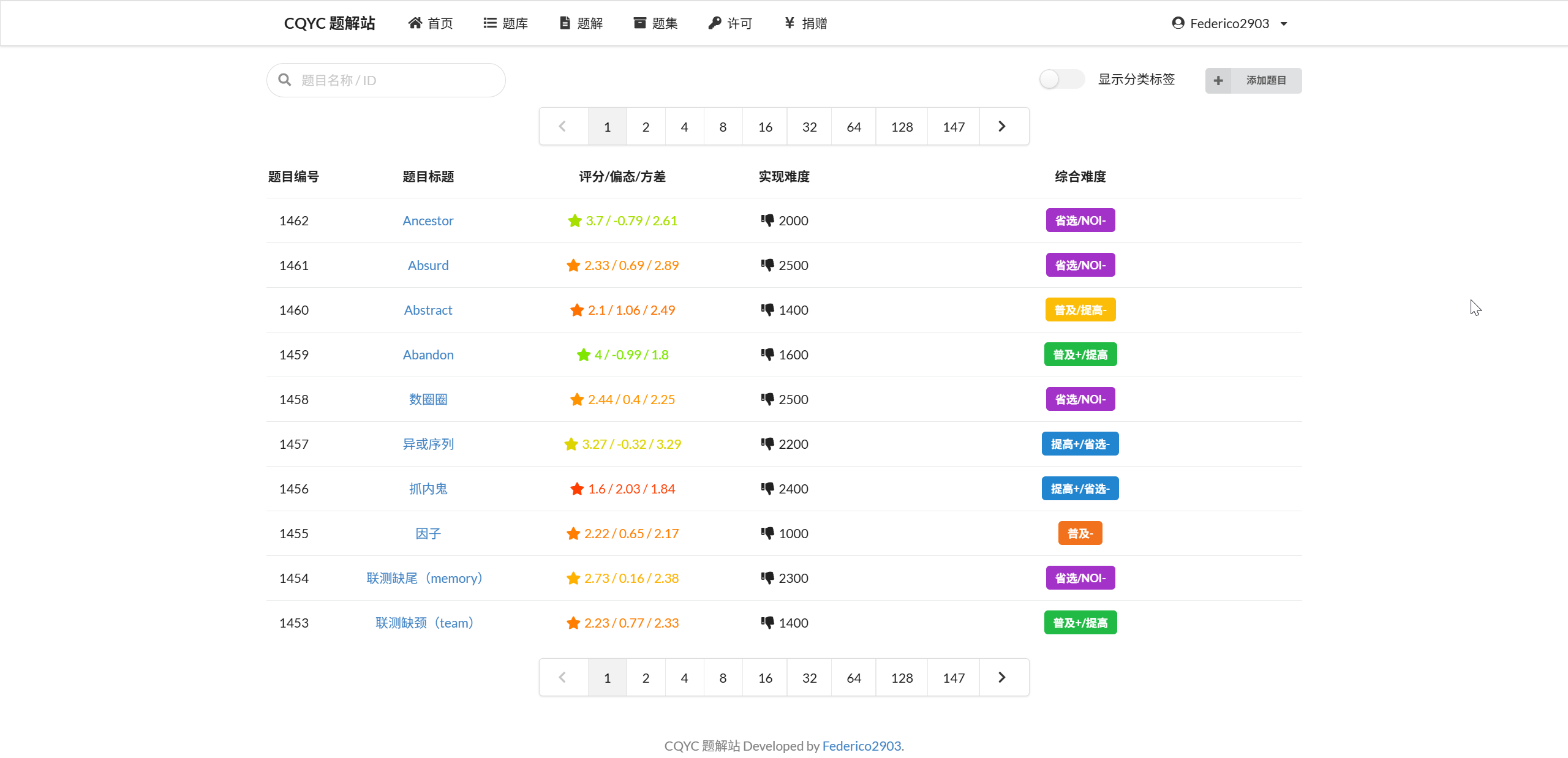 不过其实这样子没有持续多久我们又开始脱产搞竞赛了(大概是 的一月份),注意到这正是 Better YCOJ 停更的时候,因为这个时候出现了一个更伟大的产物!真正意义的 CQYC 题解站!里面 以上的代码由我独立完成,能够保存题目,从校内 OJ 导入题目,给题目打分,创建题集,细分的权限管理,以及借鉴的 SYZOJ 的 UI 布局风格甚至是 OAuth。