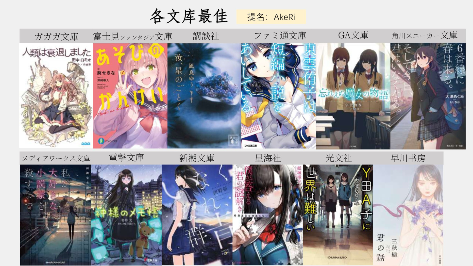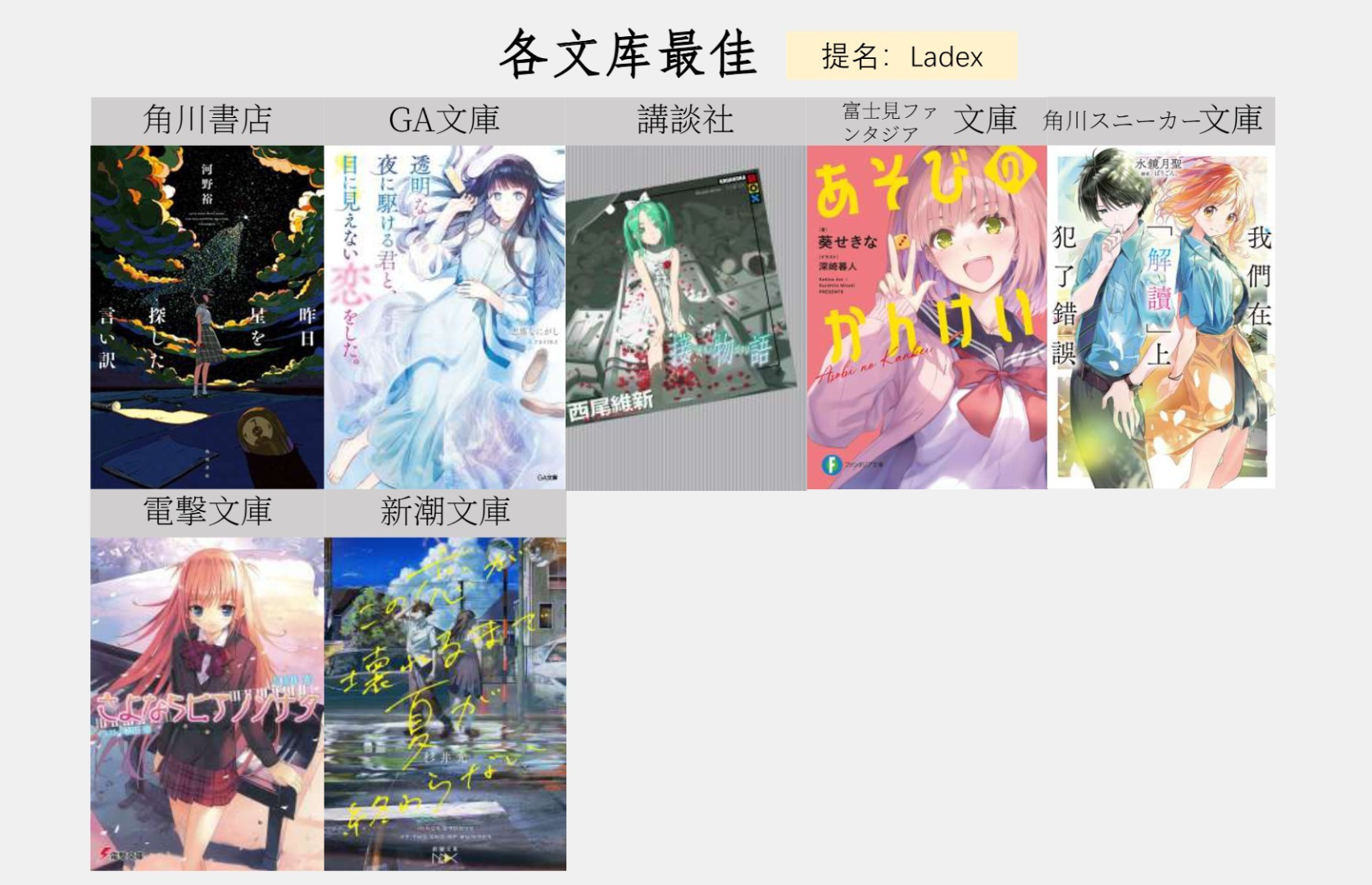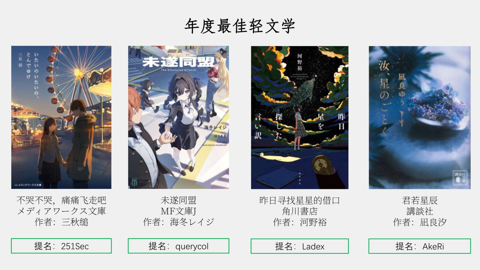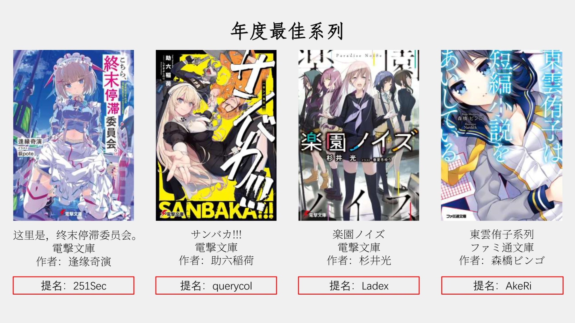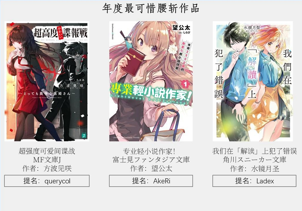 这次群刊感觉没写啥 /kel:高达 1k 字的接龙和 TNA 提名。TNA 提名大部分搬的 bangumi 短评就是了,欢迎大家来加我的 bangumi 好友 /kk:https://bangumi.tv/user/nakaayane。接龙讨论上面有了不再赘述。关于 TNA 提名,再次强烈推荐大家来读中西鼎老师的作品,不得不品的一环,读中西鼎就像把巧克力和答辩融化了混在一起,你得读了才知道你读的这本是纯良美味巧克力,还是整本答辩,抑或是用精美文笔巧克力包裹的臭构式。