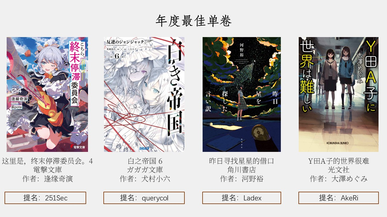 群刊这次的超长同人还没看,跪求马赛雪老师的原谅。三题感觉大家写的都挺好啊,不过怎么一半是百合,吓哭了。还有几篇动画杂谈年终总结,都是怎么做到看这么多动画的,给动漫高手跪了,(快跑,🍍🚪来了)。像我今年就没看多少动画吧,千岁......裕梦......也该加训轻小说了 /fn。