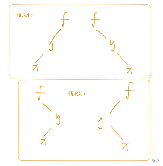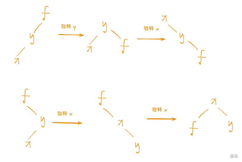 - 当 为 的父节点的左儿子,则旋转 即右旋 。