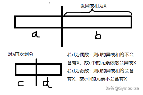 原题意显然没有入手点,那么我们考虑先从操作上找性质。容易发现的是自一次划分过后,每个数都会异或上另一边的异或和,那么这个异或的值的传递性会与序列的奇偶性密切相关。