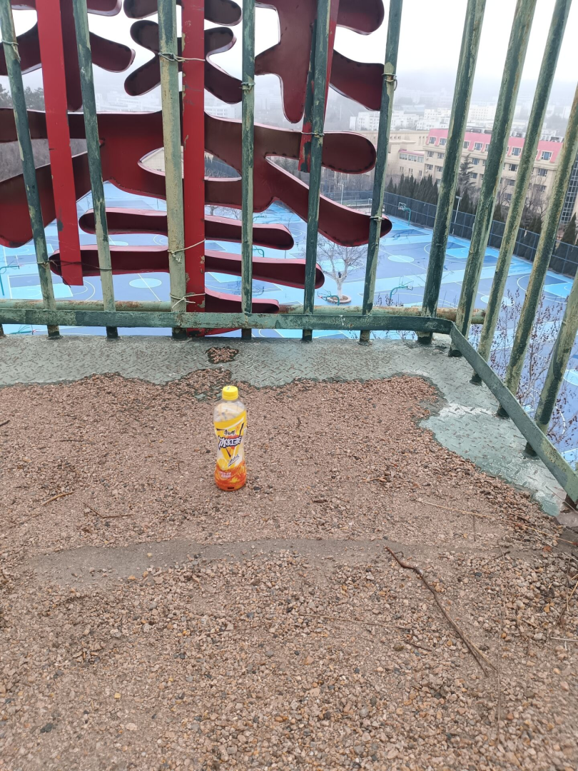 翻过这个石头就能到达目的地了。这里有铁栏杆和铁台,栏杆外挂着“攀岩基地”四个大字,虽然我也不知道谁能从这一二十米的悬崖爬上来。眼前便是悬崖,悬崖下就是操场。