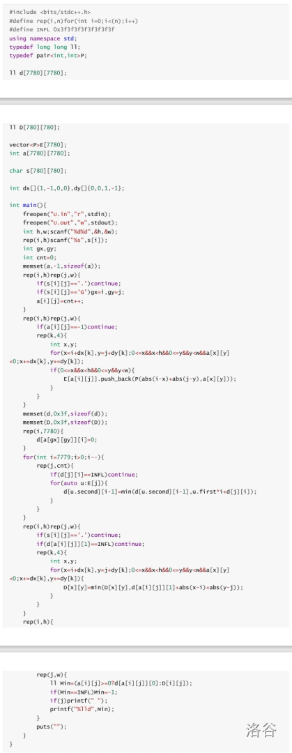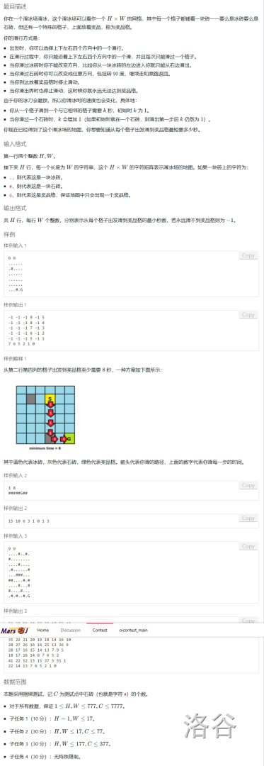 建图跑最短路,可以只保留那 个石砖,这样它们之间至多 条边,对于冰砖上的询问可以枚举它初始往哪个方向滑然后通过第一个碰到的石砖求出答案。