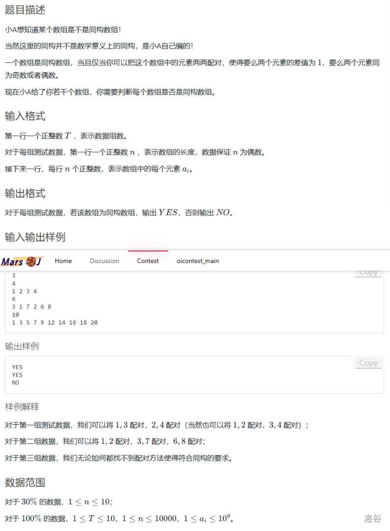 所以在此类情况下,若存在 的情况,则必定可以凑成,因为这两个配对之后,奇数和偶数都会减少 个,此时偶数和奇数的个数都为偶数了,输出