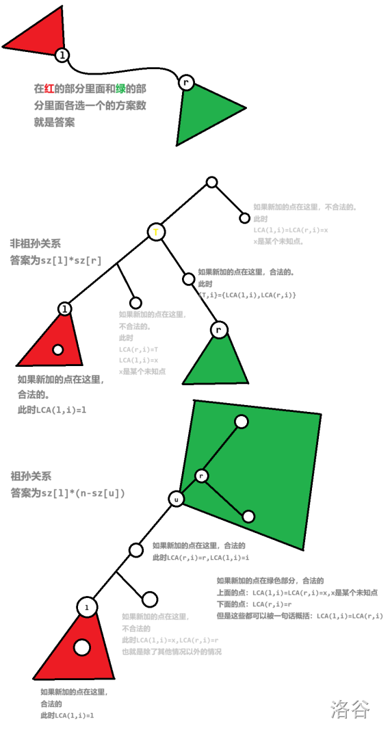 考虑如何维护 。对于已有的 。有两种情况:祖孙关系或不是祖孙关系。如果 不是祖孙关系,考虑 在哪里合法。只有三个地方: 子树、 子树、 路径上。前两种情况简单,但是什么时候 位于 路径上呢?