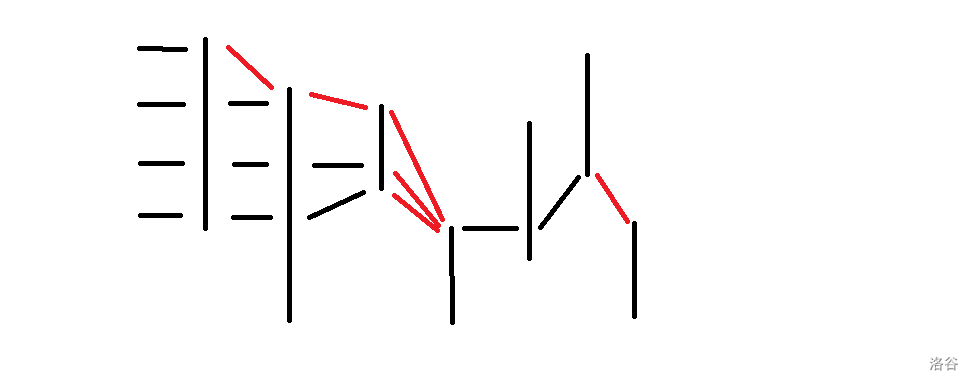 如图,竖线为题目给的区间,横线为路径,其中红色的需要代价。在第四条竖线处,所有起点都被压缩到了一个点上。