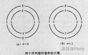 或者,也可以形象地理解为先将一个序列反序,再将两个序列分别按 逆时针 和 顺时针 顺序放到两个同心圆上,逐位旋转相乘,每种旋转状态下的积的和就是结果序列该项的值(细节实现可能还要一些规定)。