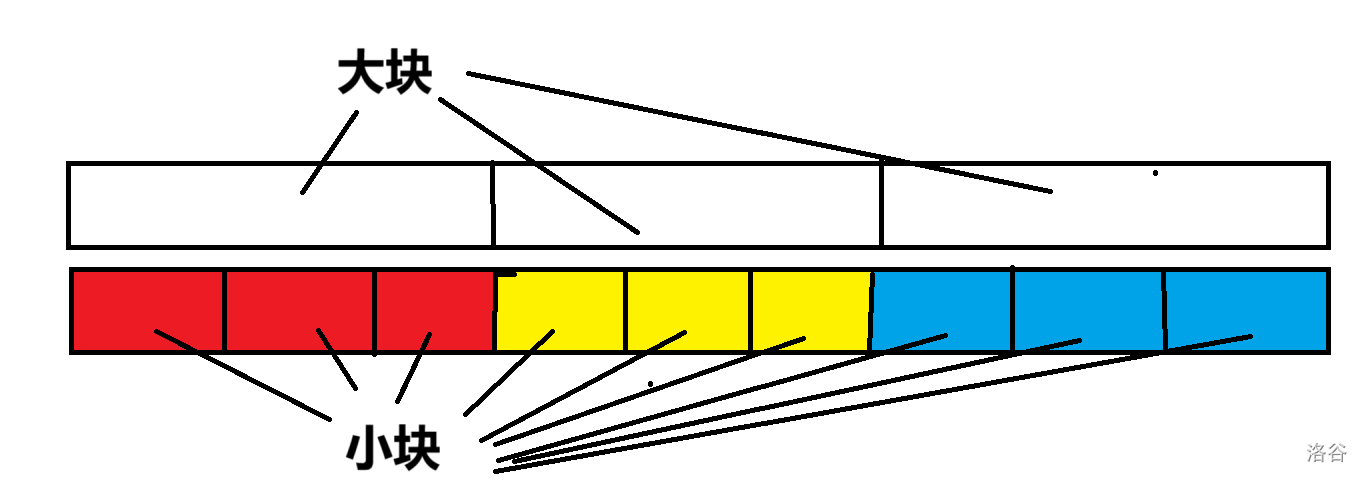 我们发现,每一个划分的区域要均匀,即每一个划分的区域长度要尽可能相等。就称每一个划分的区域为大块,原数组称为小块,划分的区域长度称为块长。这三个东西基本算是分块的三要素了。