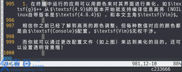 - 在终端中运行的应用可以用颜色来对其界面进行美化,如++ 从的版本开始就支持编译信息高亮(NOILinux自带版本是),和本文主角。