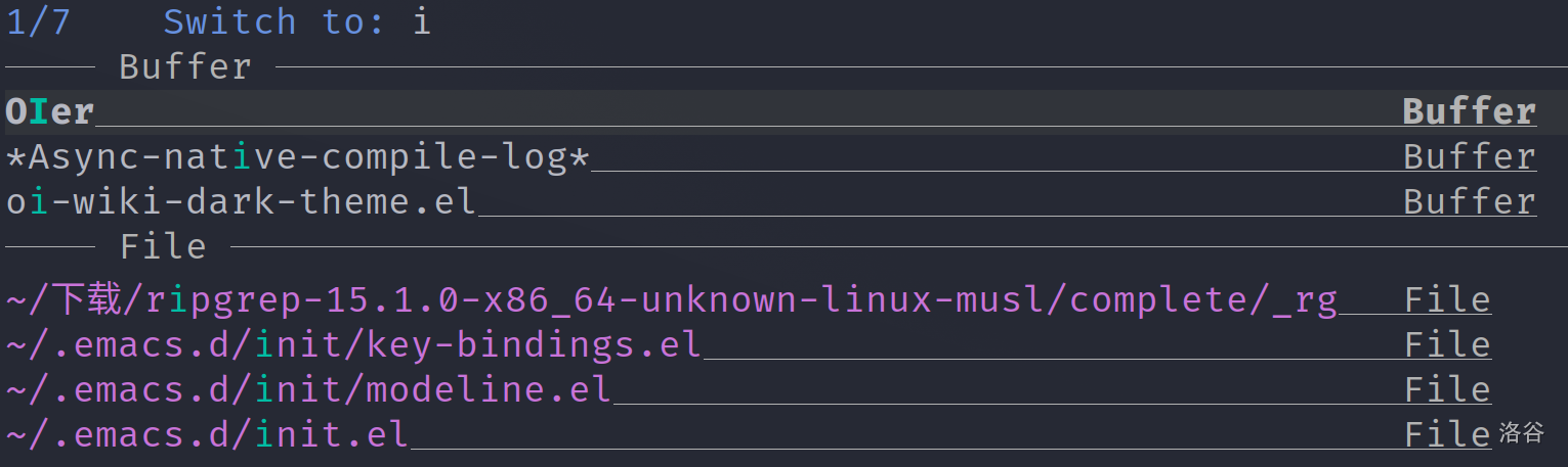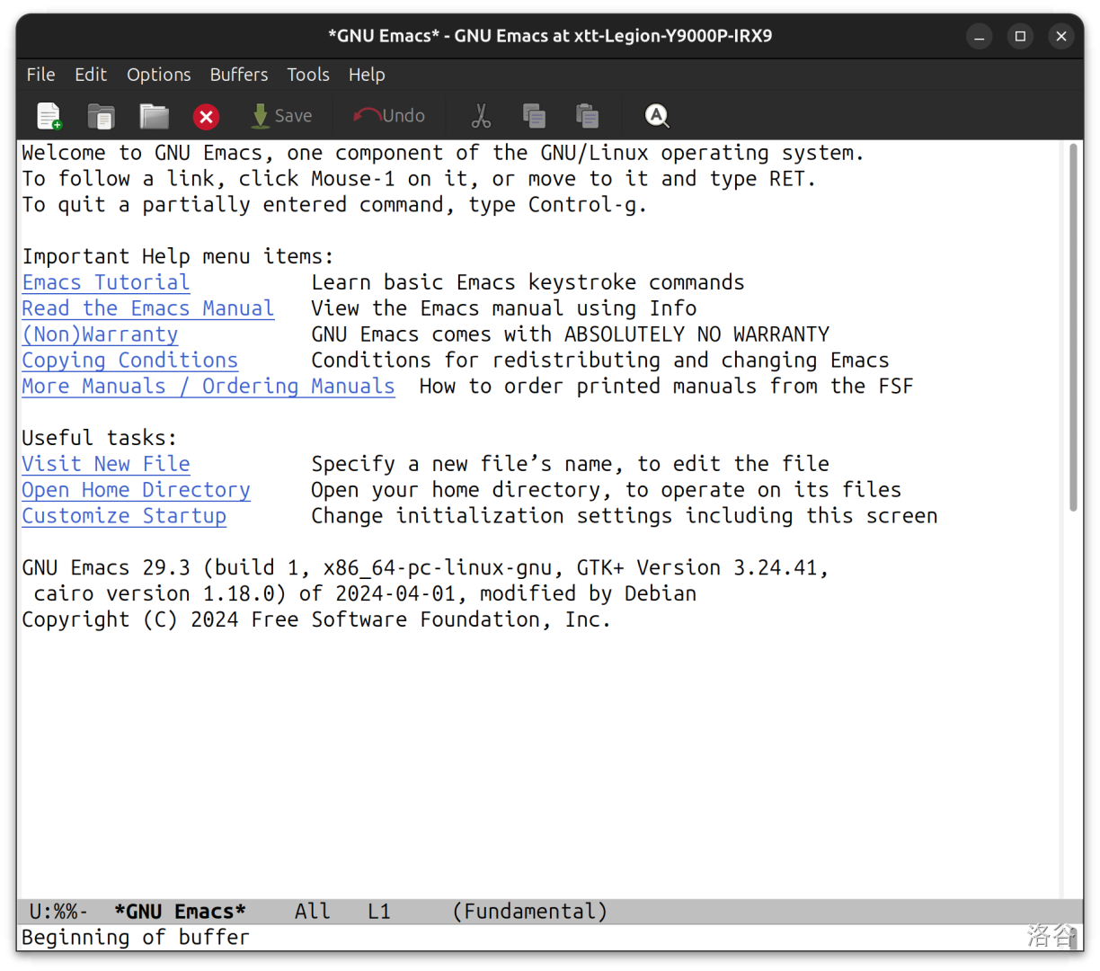 - minibuffer:modeline 下面就是 minibuffer。minibuffer 用来显示一些信息或提示。上图中 minibuffer 里显示着“Beggining of buffer”的字样。在 minibuffer 输入时可以向终端那样按