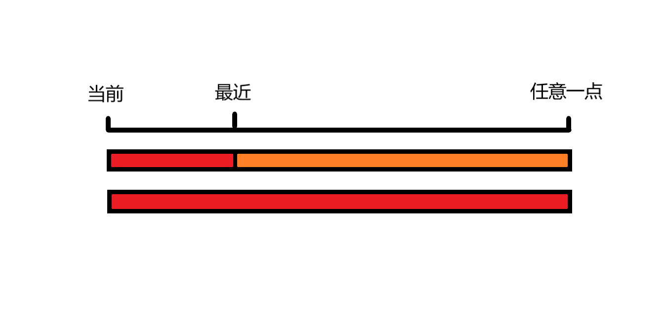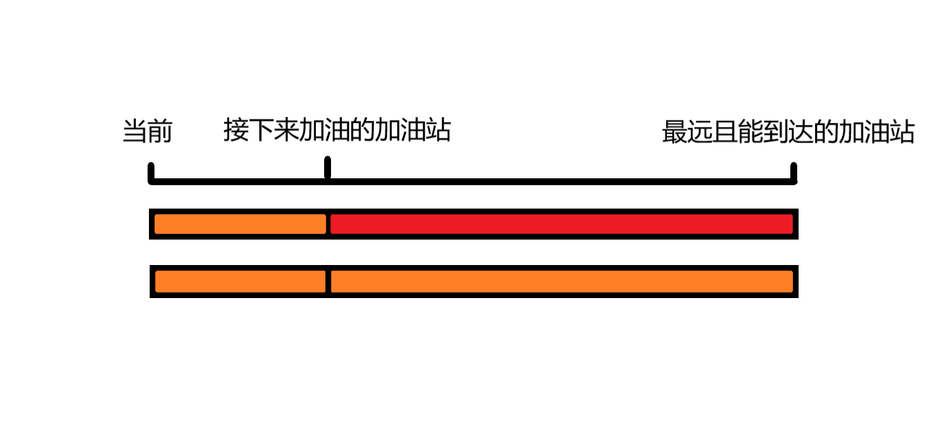 第一类比较容易,肯定是先使油能够开到离自己最近且比当前加油站便宜的油站,我们设红色是当前加油站加的油,橙色是离自己最近且比当前加油站便宜的加油站加的油,见下图: