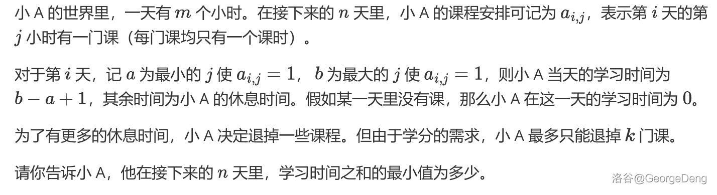 设第 天有课的时间为 ,最左边的是 ,最右边的是 。我们枚举当前是第 天,要剩余 个课时,我们能够很快得到满足条件的最短区间。它的代价是 ,价值是区间长度。