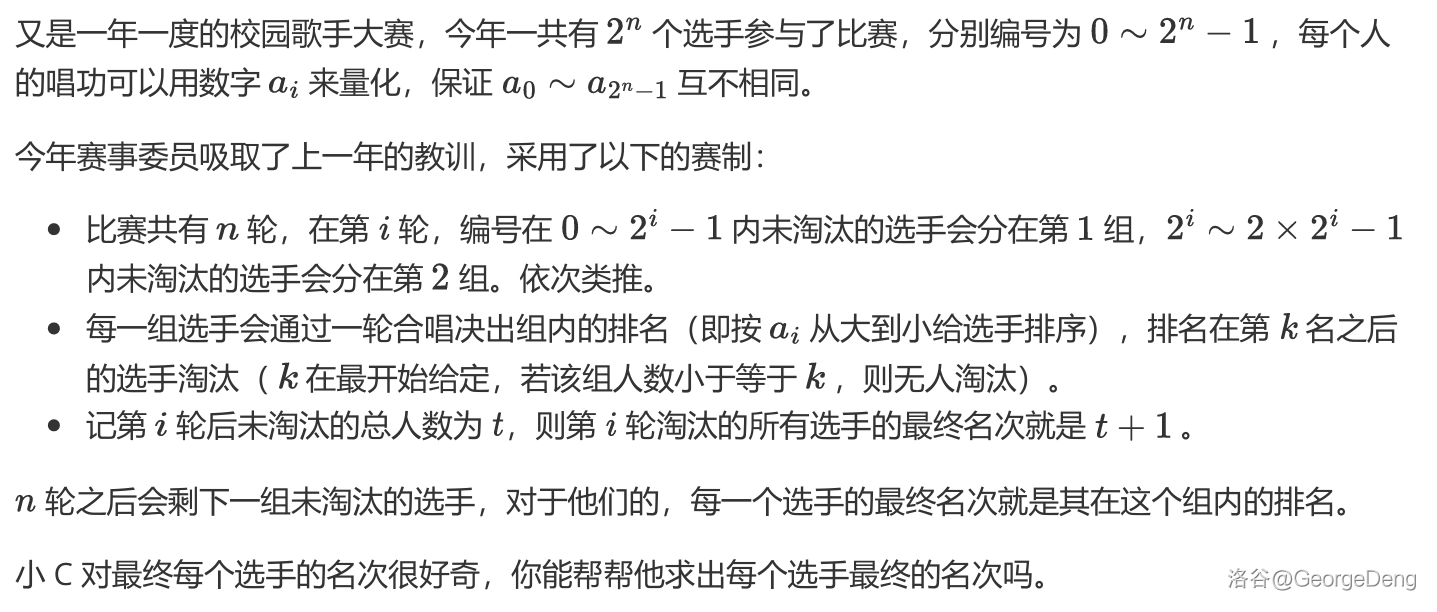 我们考虑把整个方法倒过来。考虑归并排序,因为每次都是折半取,所以符合题目要求,而且区间内还是排序好的,于是直接修改答案即可。时间复杂度 。