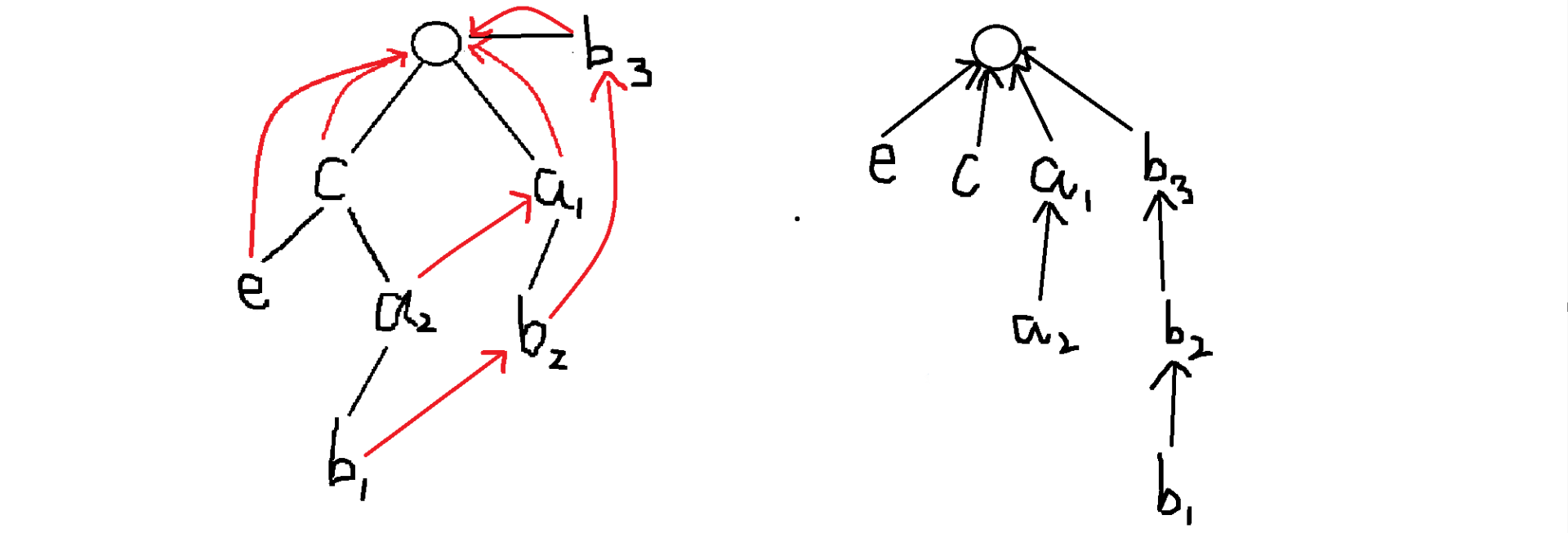 在这个图里面,我们走到 和 的时候都要更新 ,所以我们思考有没有只更新一次的做法,而这个时候,聪明的我们发现图中的红色边不就正好构成了一个树形结构吗,我们把这个部分拿出来单独拆解,为了对照方便,我们给原图里字符相同的点都编个号: