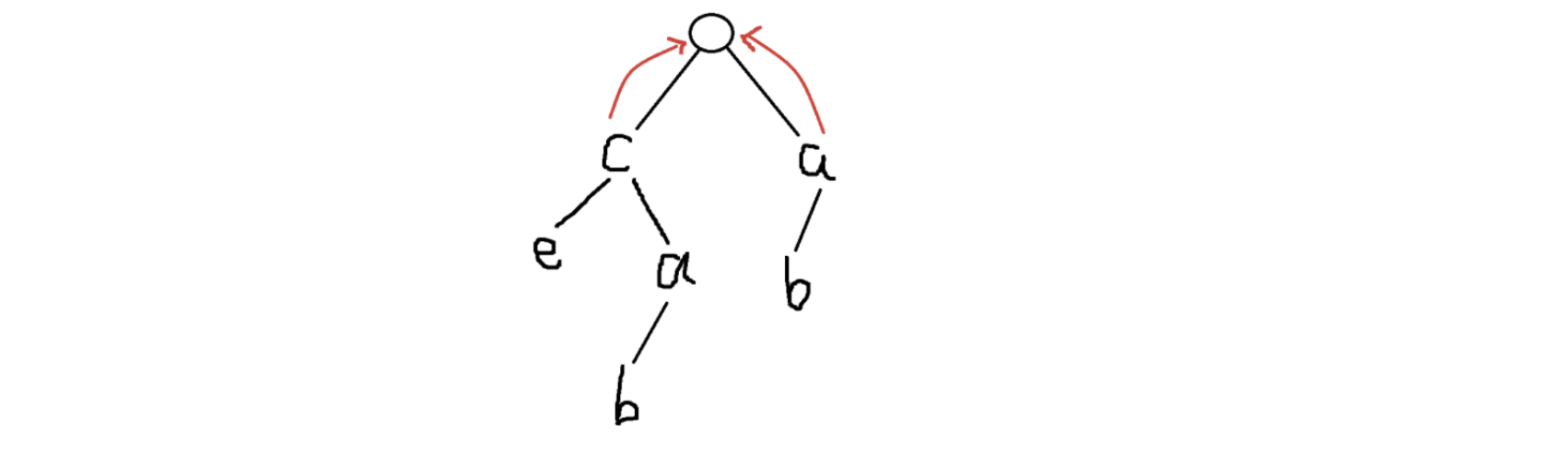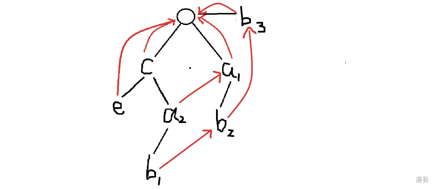 这里我们用了一种类似 bfs 的方法去完成,从 的定义我们可以发现,一个字符串的起点位置无论如何都不可能有前缀,所以这些点一定指向根,这里图中的红色边就是 边。