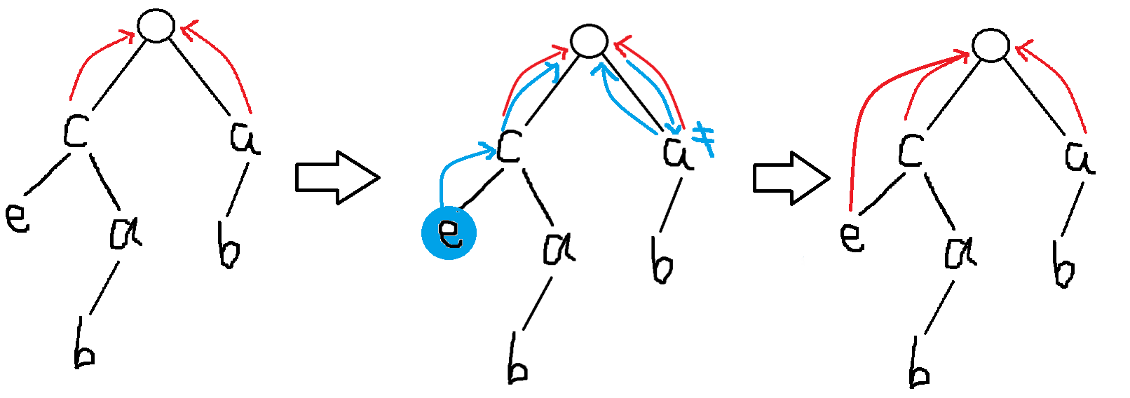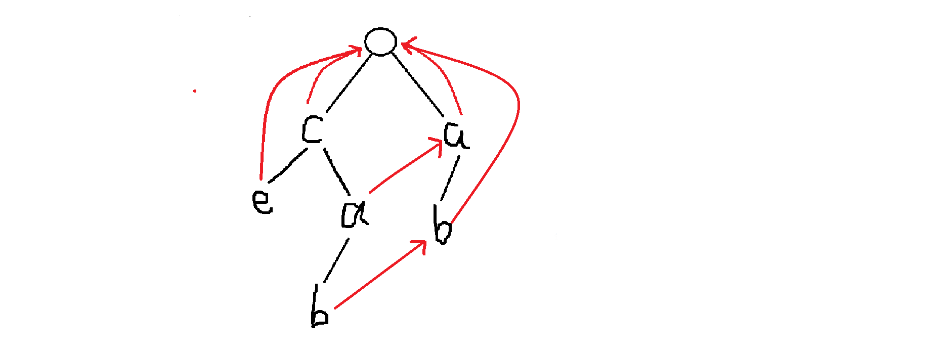 这里我们去求了图中这个蓝色的 的 指针,具体流程是,我们跳转到父节点的 ,然后看它的子节点中有没有和我相同的节点,有的话就连一条边,没有就连到根上,注意不是连父亲的 ,最终我们连出来的就是这样的。