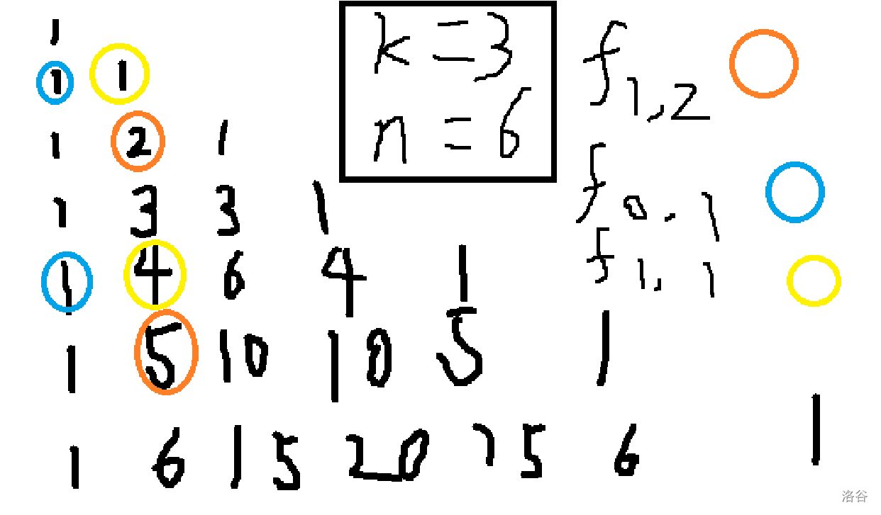 for (int r = 1; r < k; ++ r ) f[x][r] = (f[x - 1][r - 1] + f[x][r - 1]) % mod, (sum += f[x][r]) %= mod;