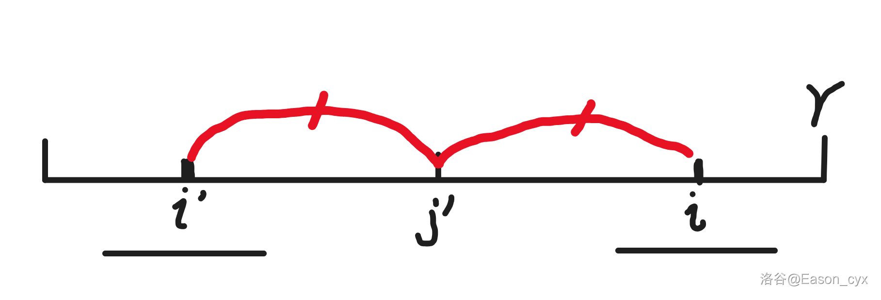 这个图是什么意思?我们首先可以找到 以 为对称中心的对称点 。然后,因为这一整个是一个回文串,所以对应地, 下面那一段(指那一段子串)和 下面那一段一定也相同。所以在这种情况下,,可以直接得出!