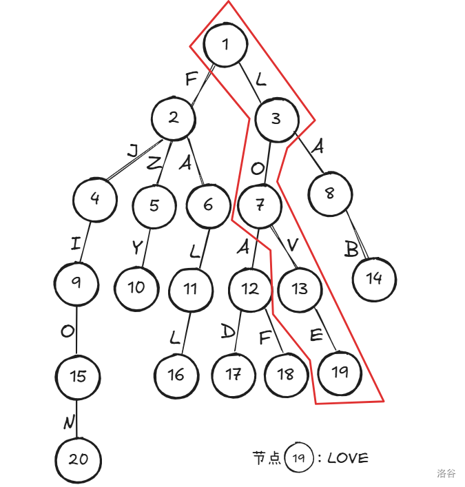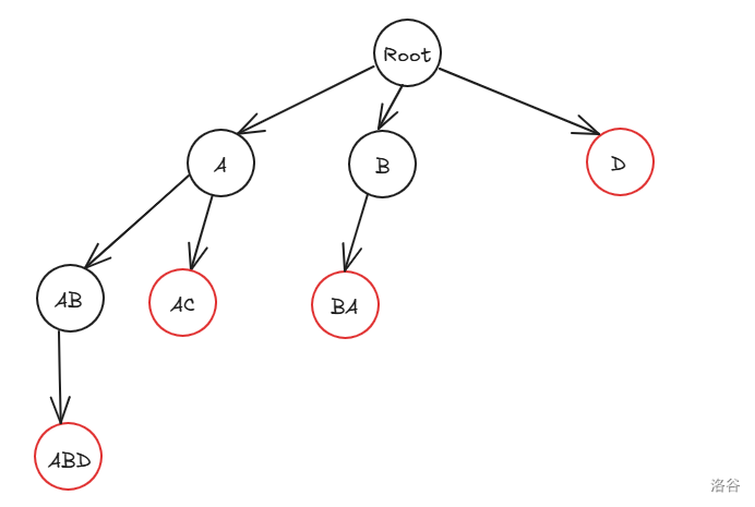 如上,在 Trie 中,每一条边都代表一个字母,那么根节点到一个节点的一条路径就是一个字符串。