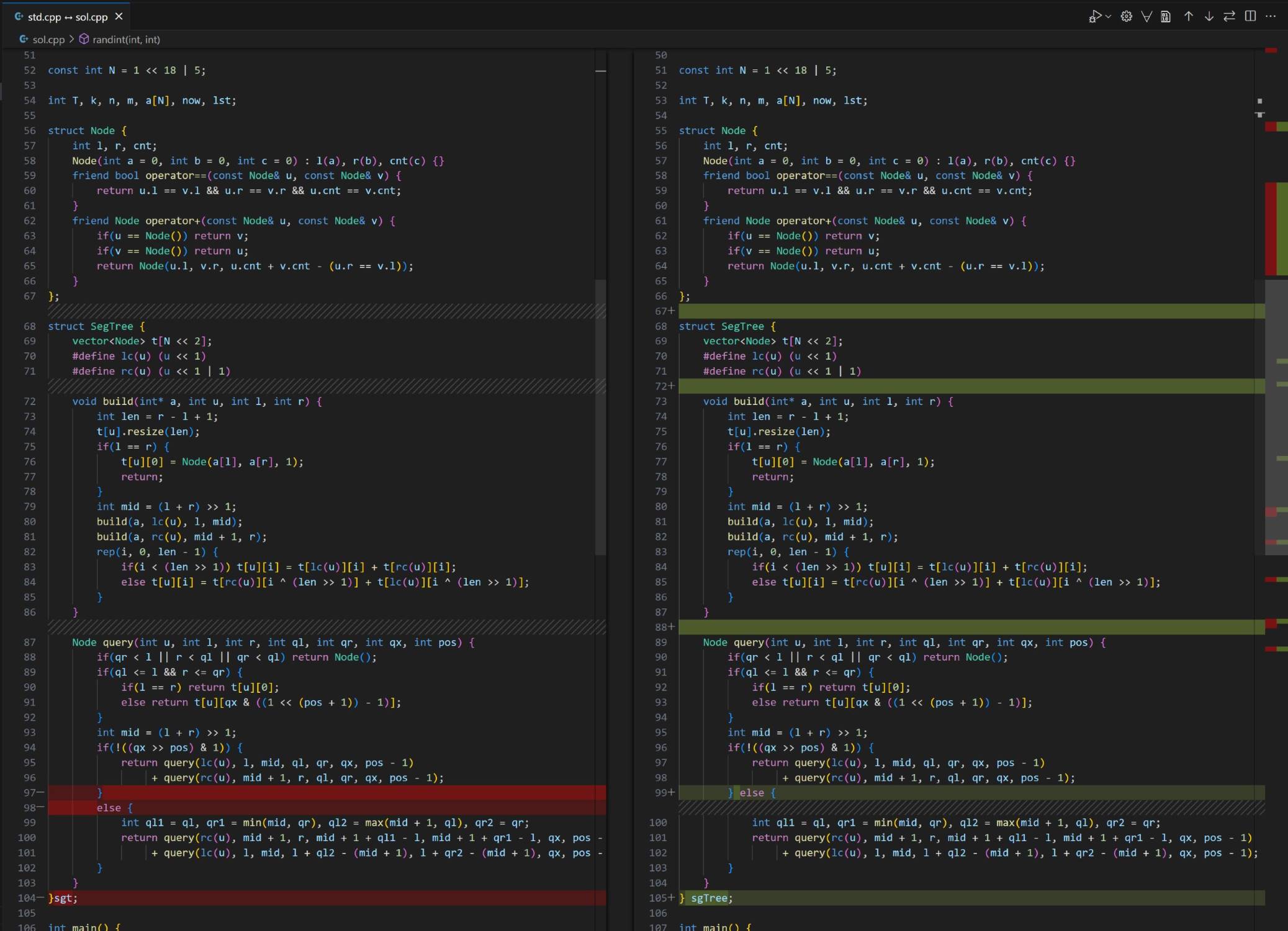 我推断该用户先通过抄袭官方题解代码并去掉 std 第一行的署名的方式 AC 了此题。在提交题解时,出于某些原因,更改了代码中部分空白字符(增删空格、换行)并更改了线段树的变量名,将代码作为题解中的代码,最终提交了题解并过审。