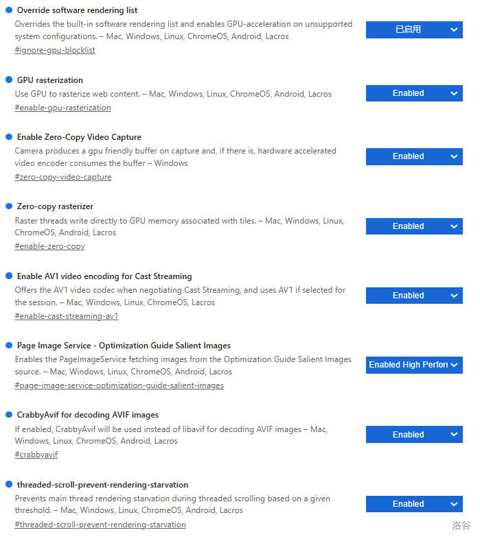 另附一张谷歌浏览器的实验性功能(访问 chrome://flags/)配置表,未经严谨测试,可能带来一定性能提升: