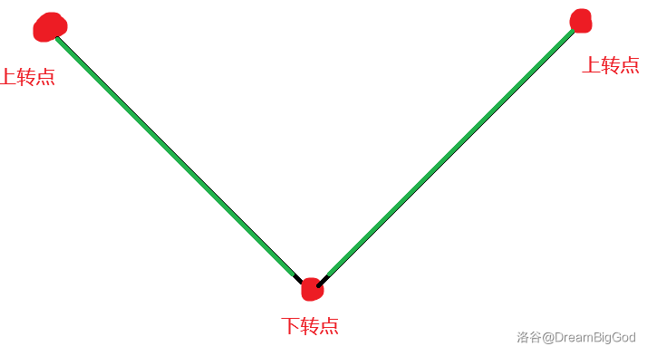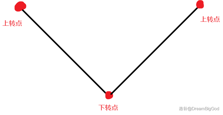 对于max(a_i-1,a_i)=max(a_i,a_i+1)满足如此条件的点,我们称之为上转点,那么对于任意两个相邻的上转点来讲,之间有且仅有一个下转点,如图: