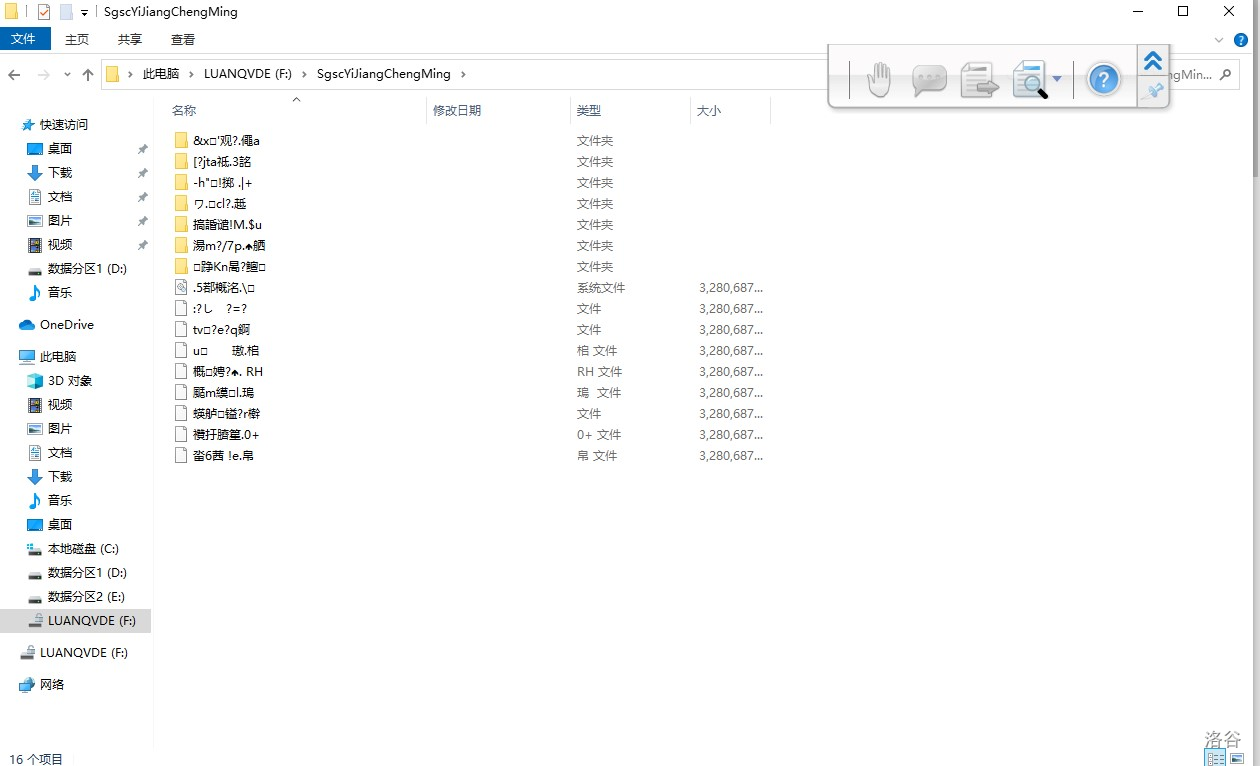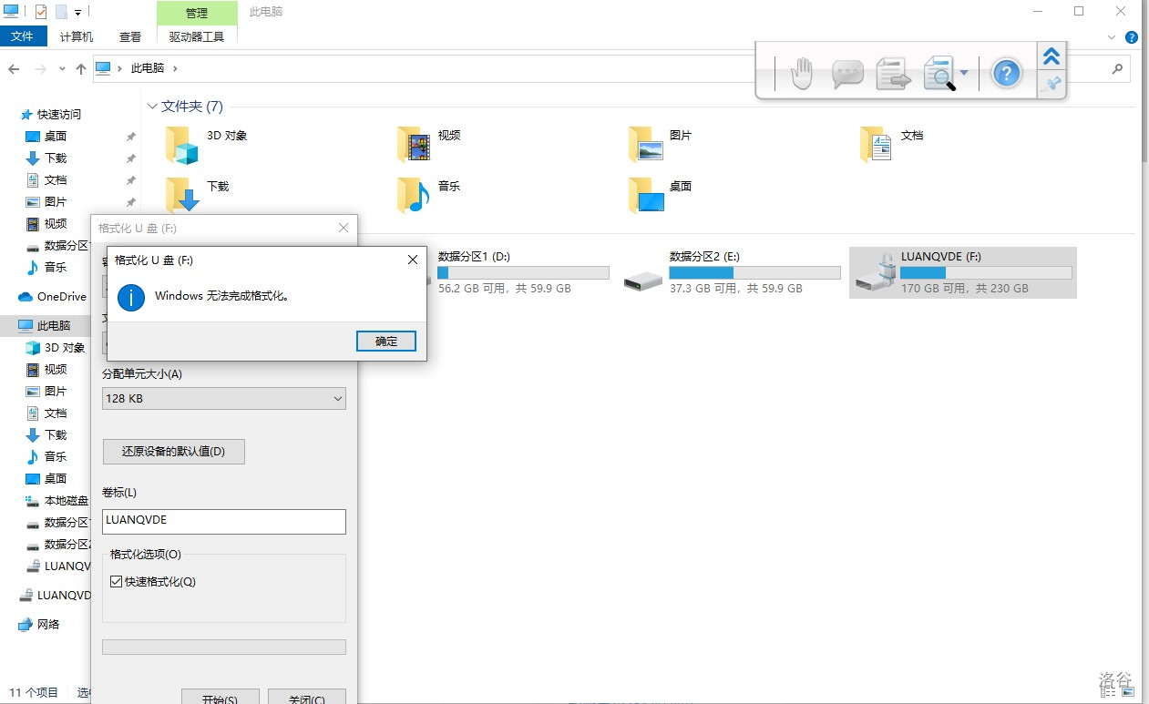 上周晚上来机房,发现U盘东西全变乱码了,上午还能正常使用,而且一开始只有部分东西变乱码,随着时间的变化变乱码的文件越来越多,且乱码文件的类型、占用内存、图标都是混乱的,下了6个杀毒软件都检测不出问题。在拷出仅有的正常文件后,尝试格式化U盘,然而显示: