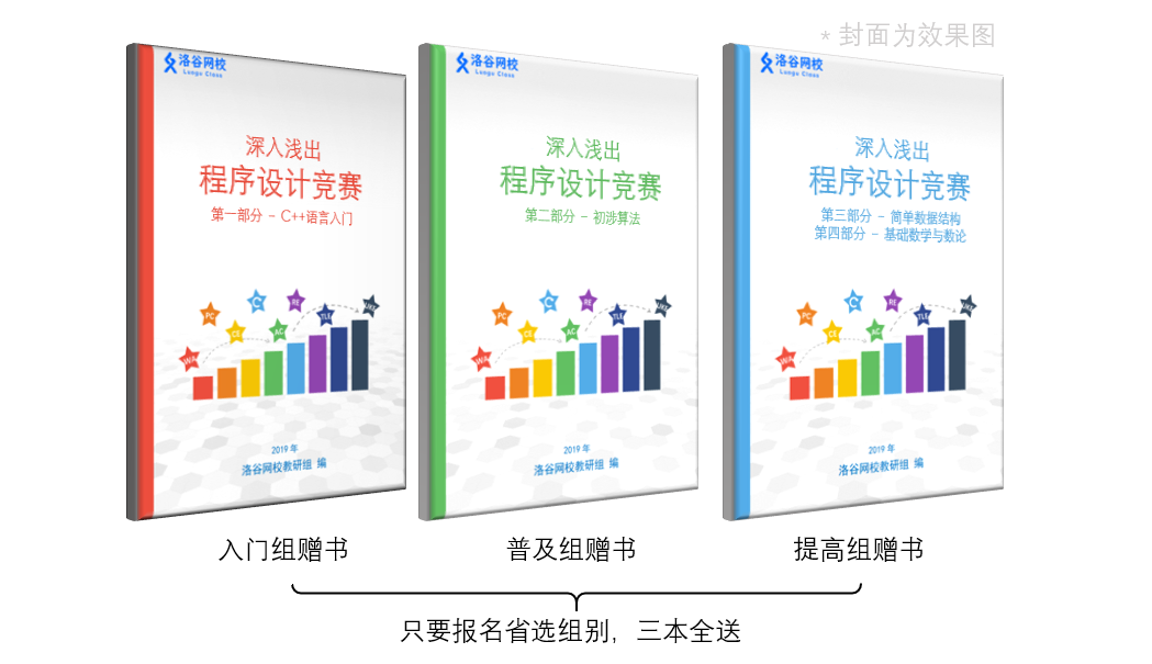 根基不同组别赠送《深入浅出程序设计竞赛 - 基础篇》试读不同部分书稿一册。因为版权原因本次课程不提供该书电子版,亦不单独出售,请同学下载授课课件。