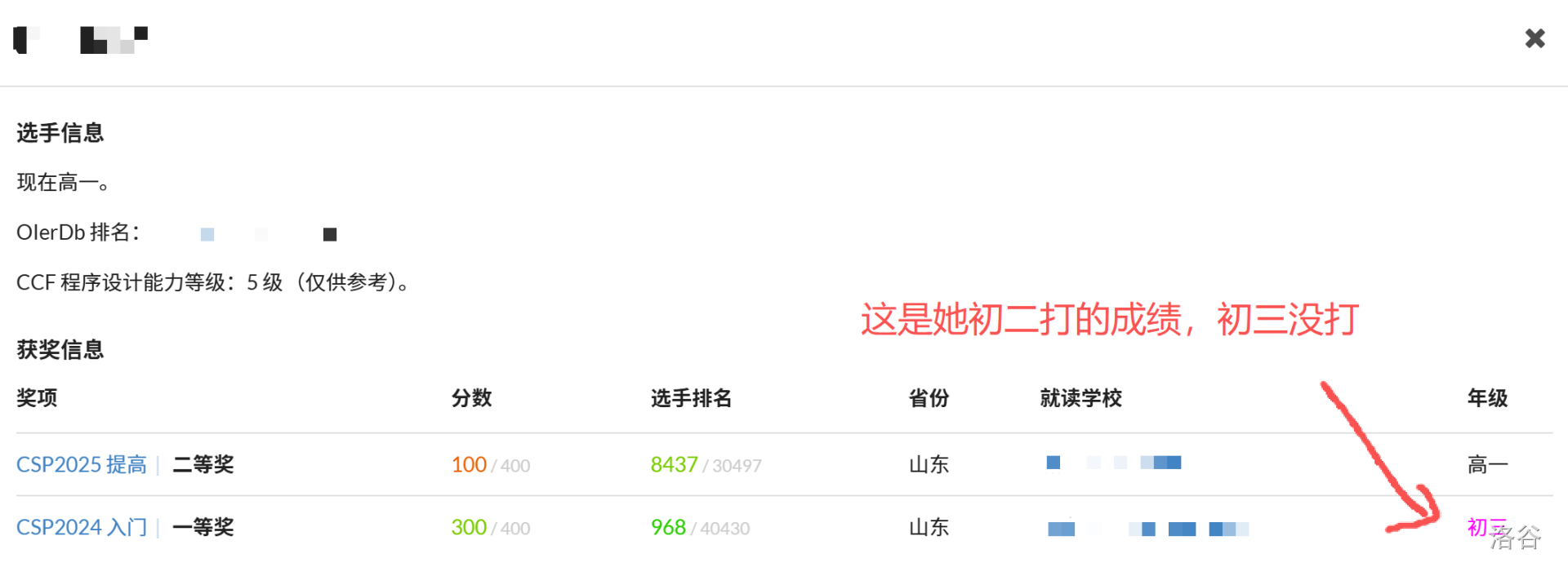 这是我同学的 OIerDb 信息,她今年初三,没参加 CSP,CSP-J 300 pts 的是她的,今年 CSP-S 的不是她的。