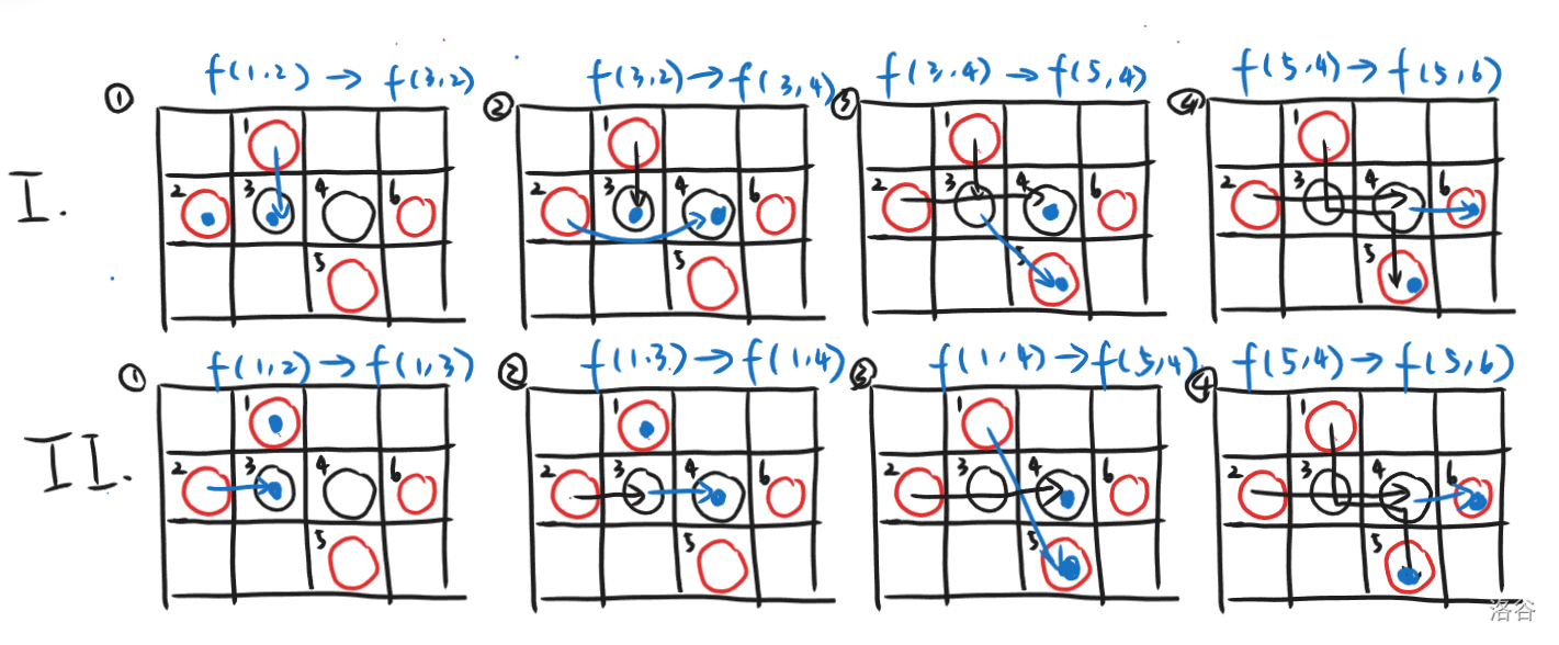 注意到,按照将所有点的 排序后,用 表示一个到 号关键点、另一个在 的方案数的 dp,并且每次选择一条路径走到 的点上,该方案会被统计两次: