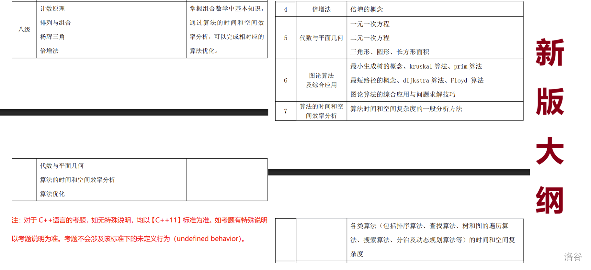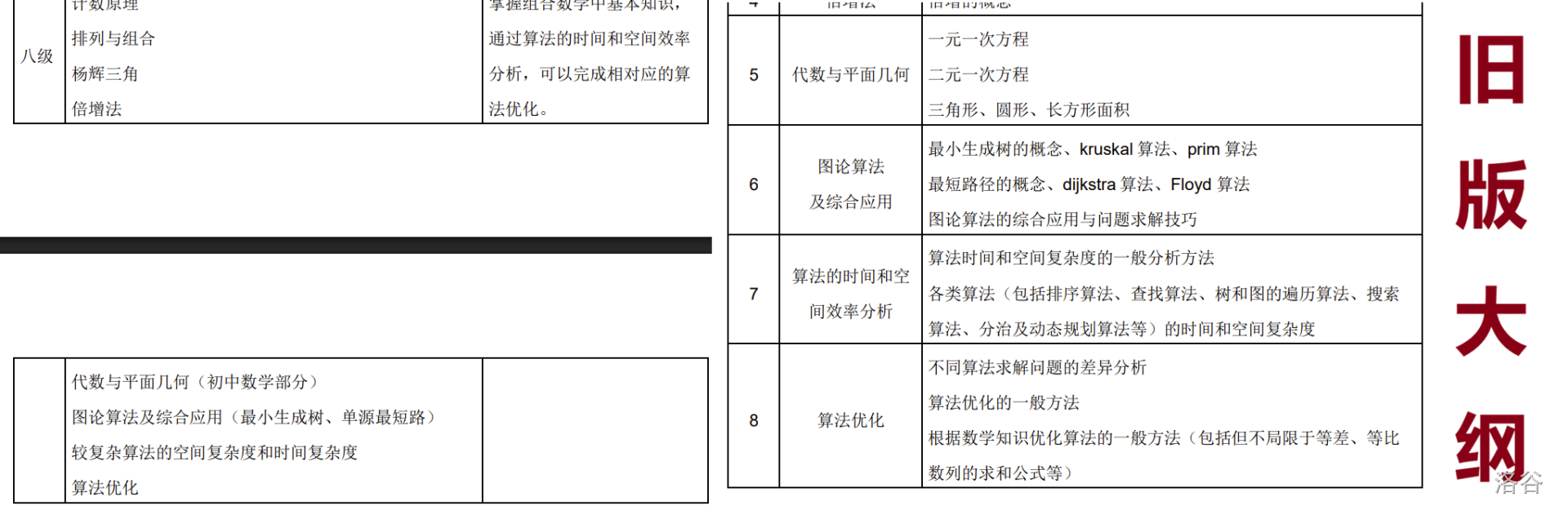 在旧版大纲中,无论是大纲最开始前两页的【认证知识体系】表格,还是具体到每个等级考察的知识点描述,都明确包含了【图论算法及综合应用】,其中包含了:最小生成树的概念、kruskal 算法、prim 算法;最短路径的概念、dijkstra 算法、Floyd 算法;图论算法的综合应用与问题求解技巧。