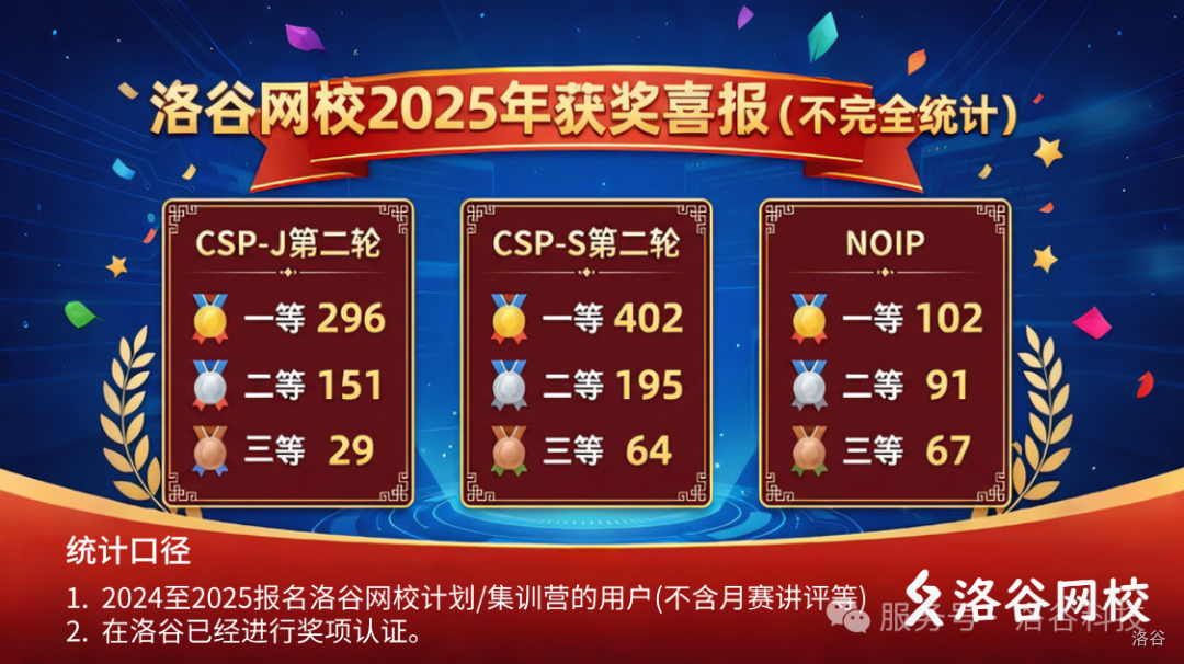 据洛谷严格口径的不完全统计,洛谷网校学员在 2025 年赛季中取得了如下耀眼成绩: