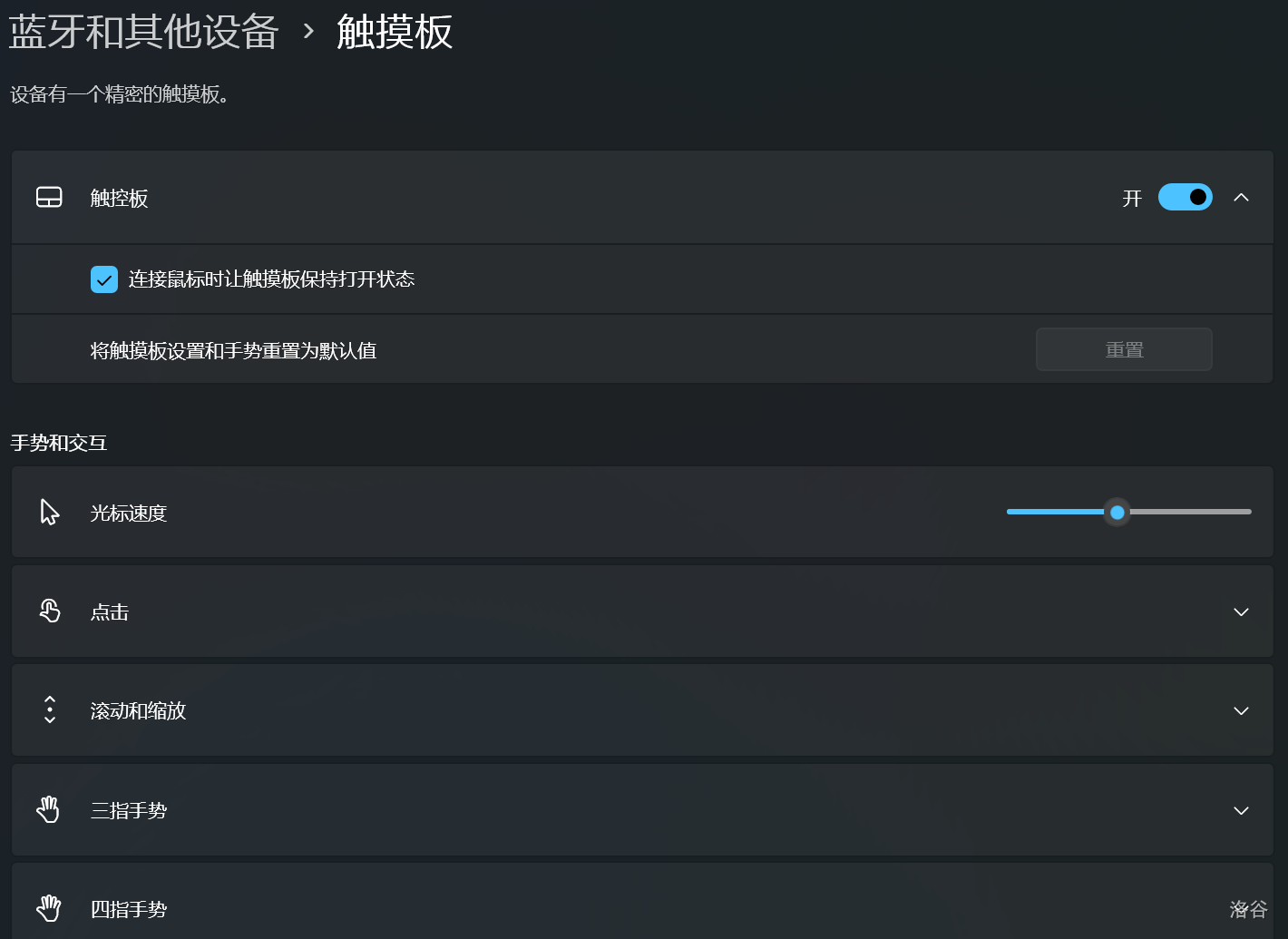 就是键盘前方这个触摸板,控制光标的,很久之前连上蓝牙鼠标之后就失灵了,也没去管,今天想调回来,设置如下: