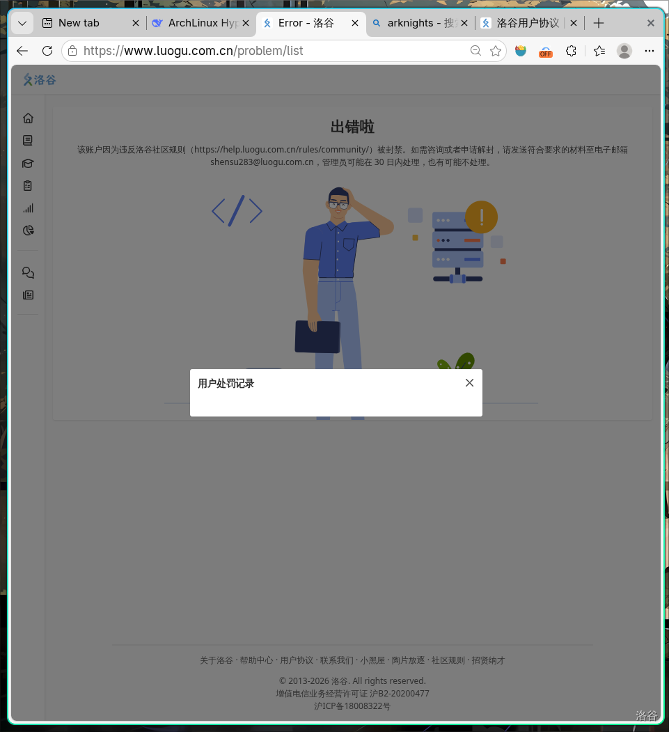 我看不到封禁原因,上面的用户处罚记录为空。